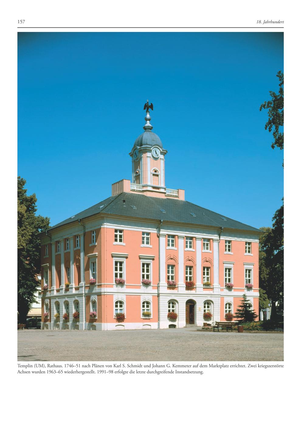 Templin(UM), Rathaus. 1746-51 nach Plänen von Karl S. Schmidt und Johann G. Kemmeter auf dem Marktplatz errichtet. Zwei kriegszerstörte Achsen wurden 1963-65 wiederhergestellt. 1991-98 erfolgte die letzte durchgreifende Instandsetzung.