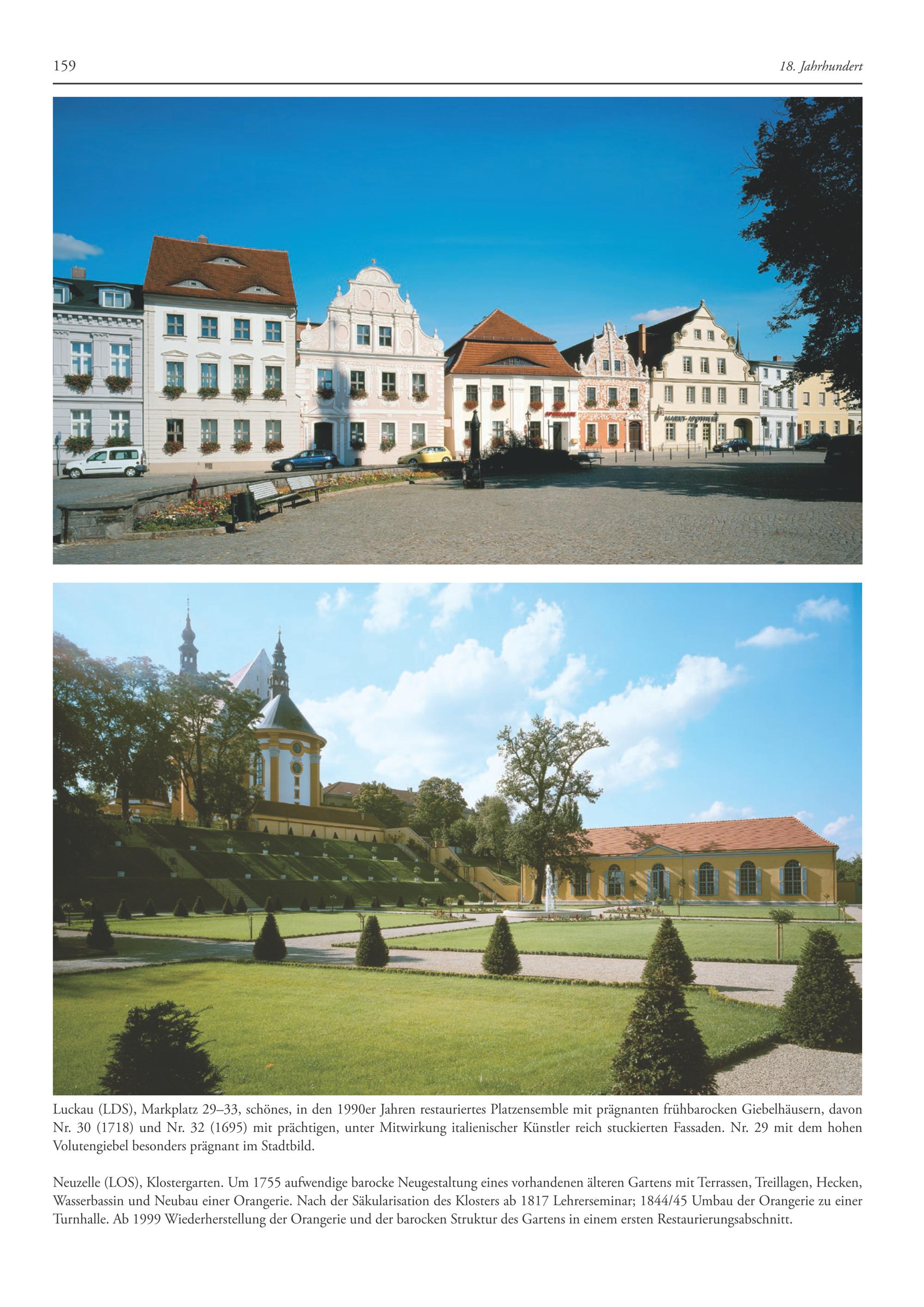 Neuzelle(LOS), Klostergarten. Um 1755 aufwendige barocke Neugestaltung eines vorhandenen älteren Gartens mit Terrassen, Treillagen, Hecken, Wasserbassin und Neubau einer Orangerie. Nach der Säkularisation des Klosters ab 1817 Lehrerseminar; 1844/45 Umbau der Orangerie zu einer Turnhalle. Ab 1999 Wiederherstellung der Orangerie und der barocken Struktur des Gartens in einem ersten Restaurierungsabschnitt.