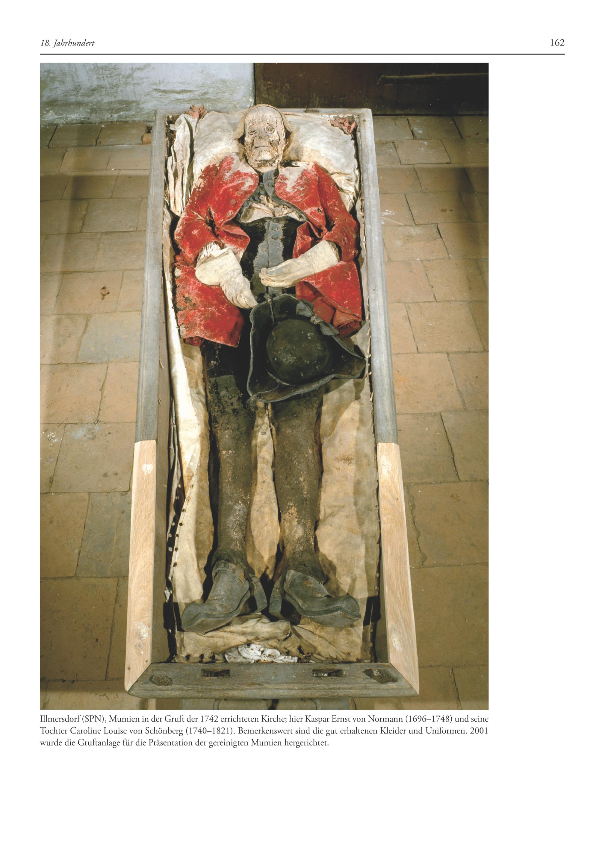 Illmersdorf(SPN), Mumien in der Gruft der 1742 errichteten Kirche; hier Kaspar Ernst von Normann(1696-1748) und seine Tochter Caroline Louise von Schönberg(1740-1821). Bemerkenswert sind die gut erhaltenen Kleider und Uniformen. 2001 wurde die Gruftanlage für die Präsentation der gereinigten Mumien hergerichtet.