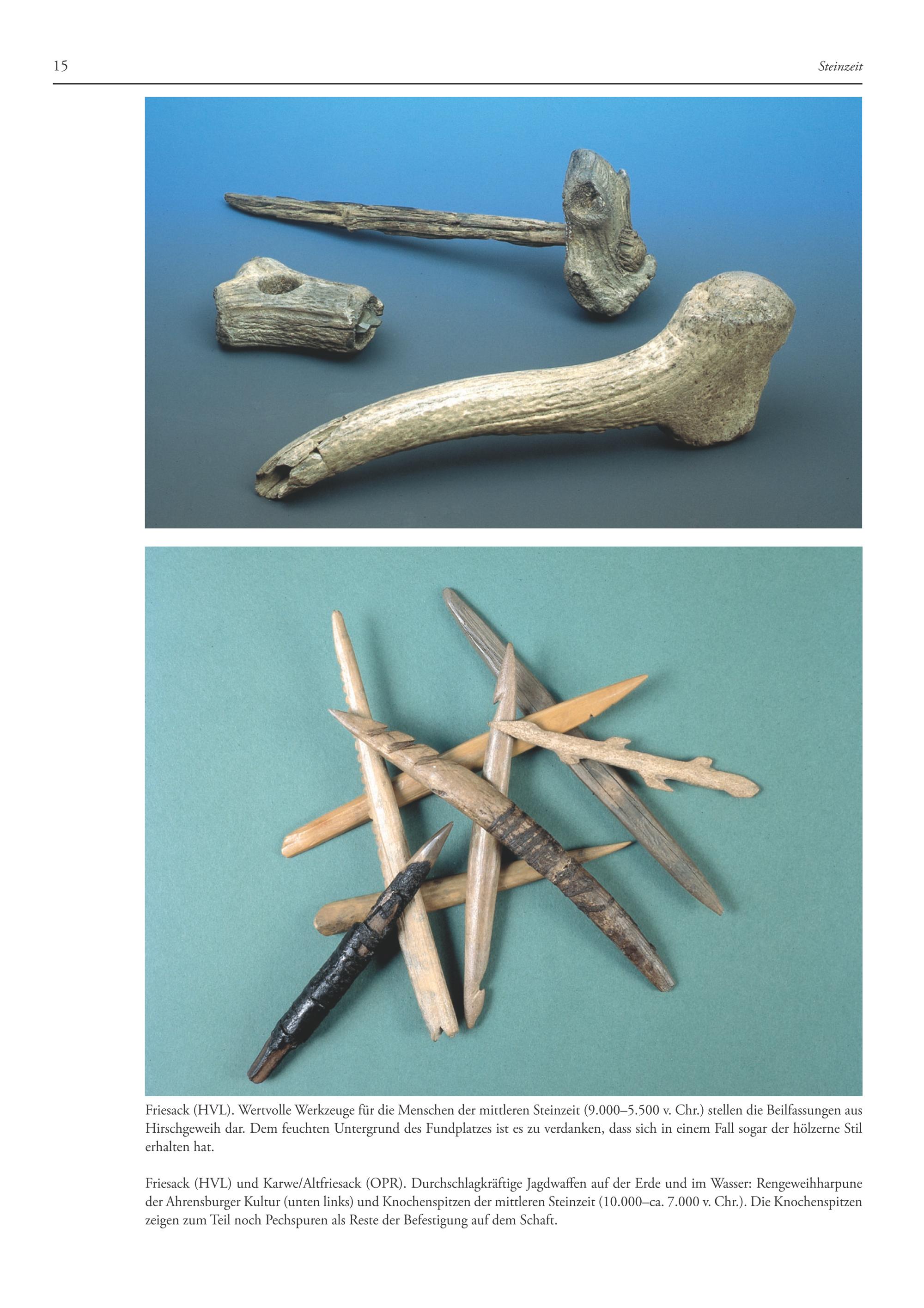 Friesack(HVL) und Karwe/Altfriesack(OPR). Durchschlagkräftige Jagdwaffen auf der Erde und im Wasser: Rengeweihharpune der Ahrensburger Kultur(unten links) und Knochenspitzen der mittleren Steinzeit(10.000—ca. 7.000 v. Chr.). Die Knochenspitzen zeigen zum Teil noch Pechspuren als Reste der Befestigung auf dem Schaft.