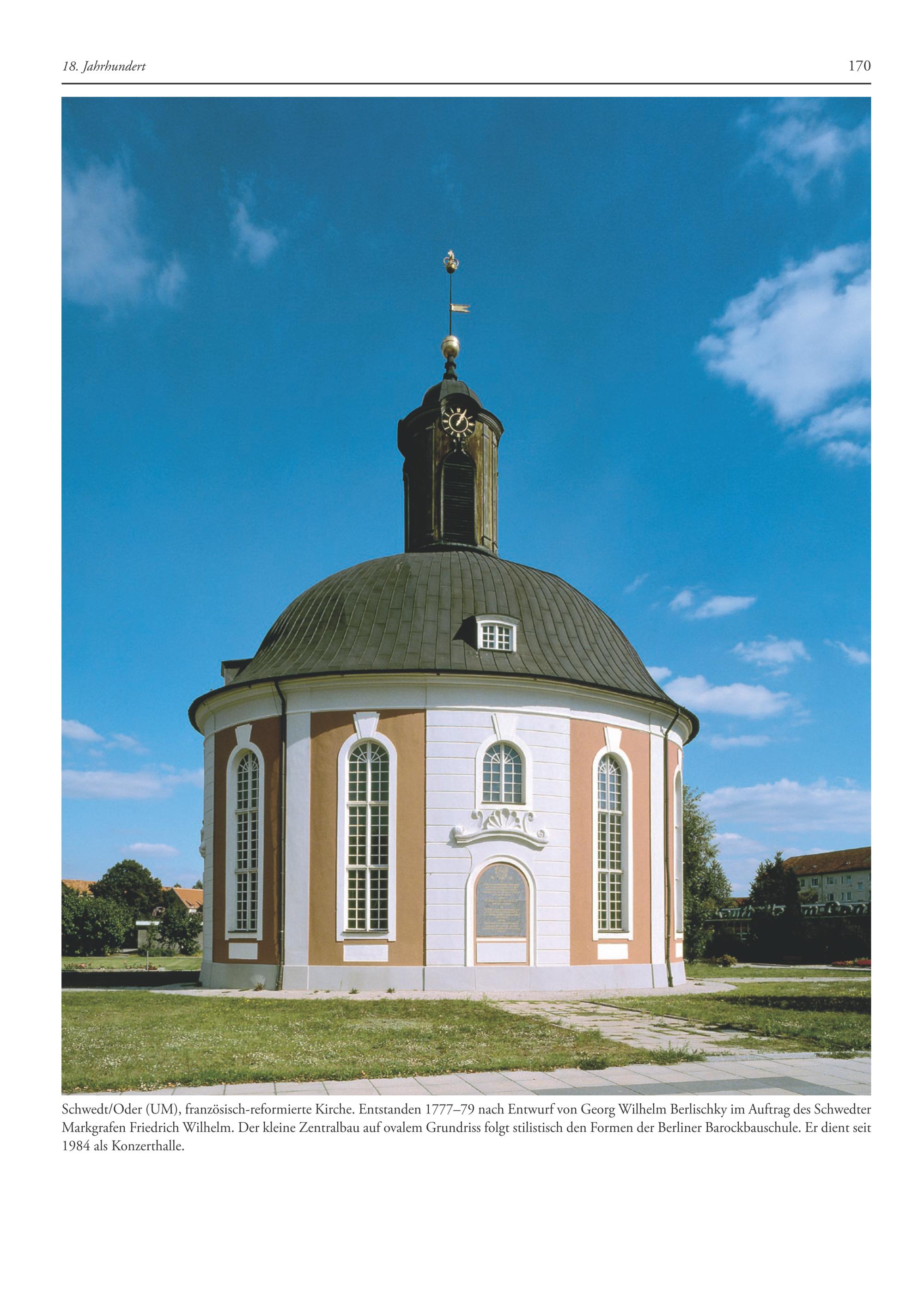PEN SF A= N Z ES— ES— ZZ Schwedt/Oder(UM), französisch-reformierte Kirche. Entstanden 1777-79 nach Entwurf von Georg Wilhelm Berlischky im Auftrag des Schwedter Markgrafen Friedrich Wilhelm. Der kleine Zentralbau auf ovalem Grundriss folgt stilistisch den Formen der Berliner Barockbauschule. Er dient seit 1984 als Konzerthalle.