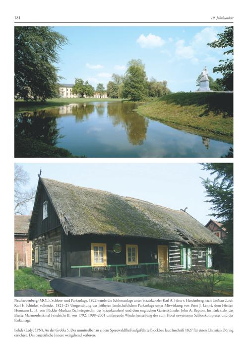 Neuhardenberg(MOL), Schloss- und Parkanlage. 1822 wurde die Schlossanlage unter Staatskanzler Karl A. Fürst v. Hardenberg nach Umbau durch Karl E Schinkel vollendet. 1821-25 Umgestaltung der früheren landschaftlichen Parkanlage unter Mitwirkung von Peter J. Lenne, dem Fürsten Hermann L. H. von Pückler-Muskau(Schwiegersohn des Staatskanzlers) und dem englischen Gartenkünstler John A. Repton. Im Park steht das älteste Marmordenkmal Friedrichs II. von 1792. 1998-2001 umfassende Wiederherstellung des zum Hotel erweiterten Schlosskomplexes und der