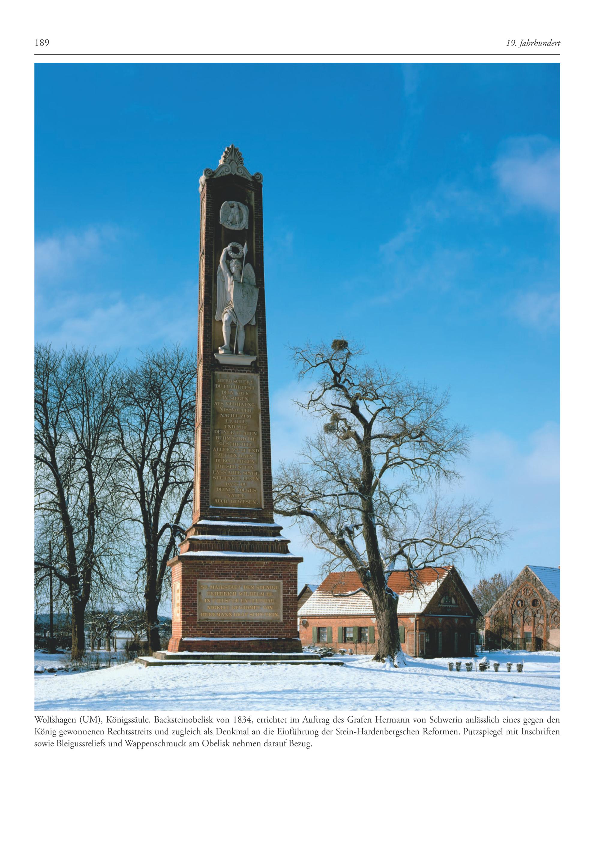 Wolfshagen(UM), Königssäule. Backsteinobelisk von 1834, errichtet im Auftrag des Grafen Hermann von Schwerin anlässlich eines gegen den