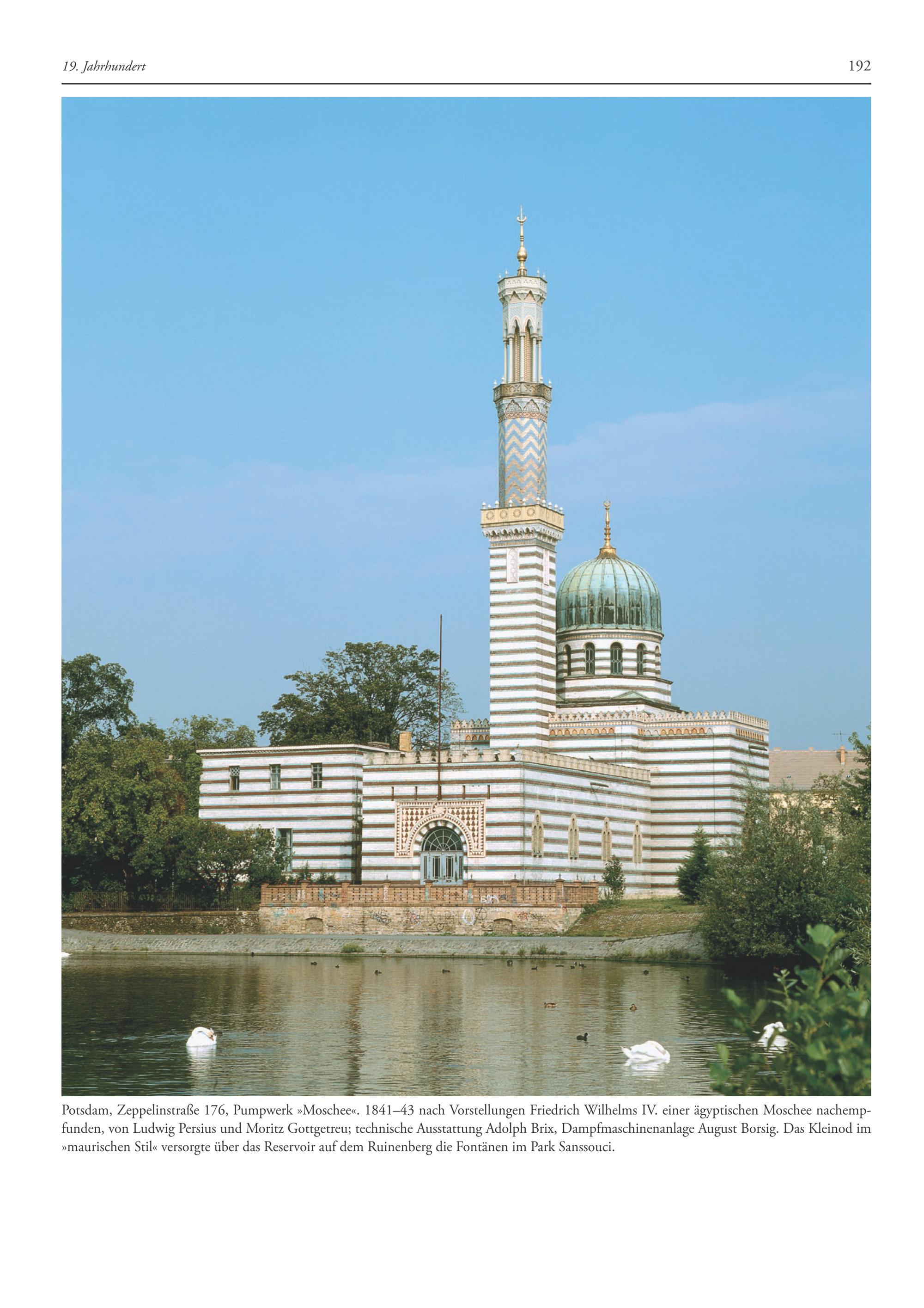 Potsdam, Zeppelinstraße 176, Pumpwerk»Moschee«. 1841-43 nach Vorstellungen Friedrich Wilhelms IV. einer ägyptischen Moschee nachempfunden, von Ludwig Persius und Moritz Gottgetreu; technische Ausstattung Adolph Brix, Dampfmaschinenanlage August Borsig. Das Kleinod im »maurischen Stil« versorgte über das Reservoir auf dem Ruinenberg die Fontänen im Park Sanssouci.
