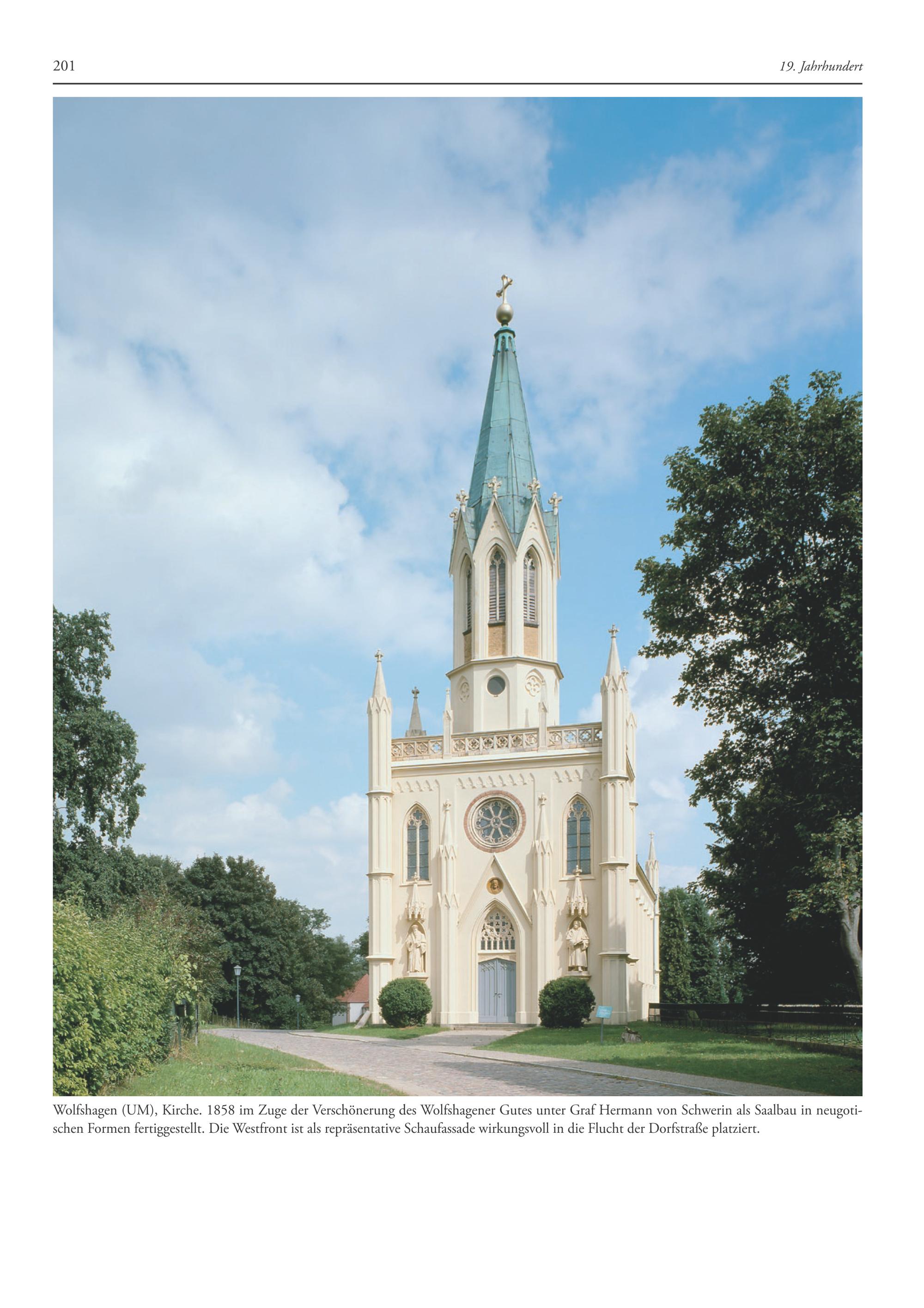 Wolfshagen(UM), Kirche. 1858 im Zuge der Verschönerung des Wolfshagener Gutes unter Graf Hermann von Schwerin als Saalbau in neugotischen Formen fertiggestellt. Die Westfront ist als repräsentative Schaufassade wirkungsvoll in die Flucht der Dorfstraße platziert.