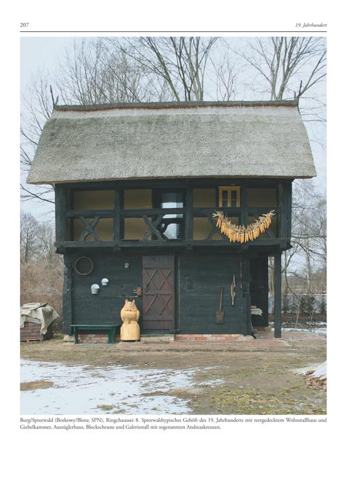 Burg/Spreewald(Borkowy/Blota; SPN), Ringchaussee 8. Spreewaldtypisches Gehöft des 19. Jahrhunderts mit reetgedecktem Wohnstallhaus und Giebelkammer, Auszüglerhaus, Blockscheune und Galeriestall mit sogenannten Andreaskreuzen.