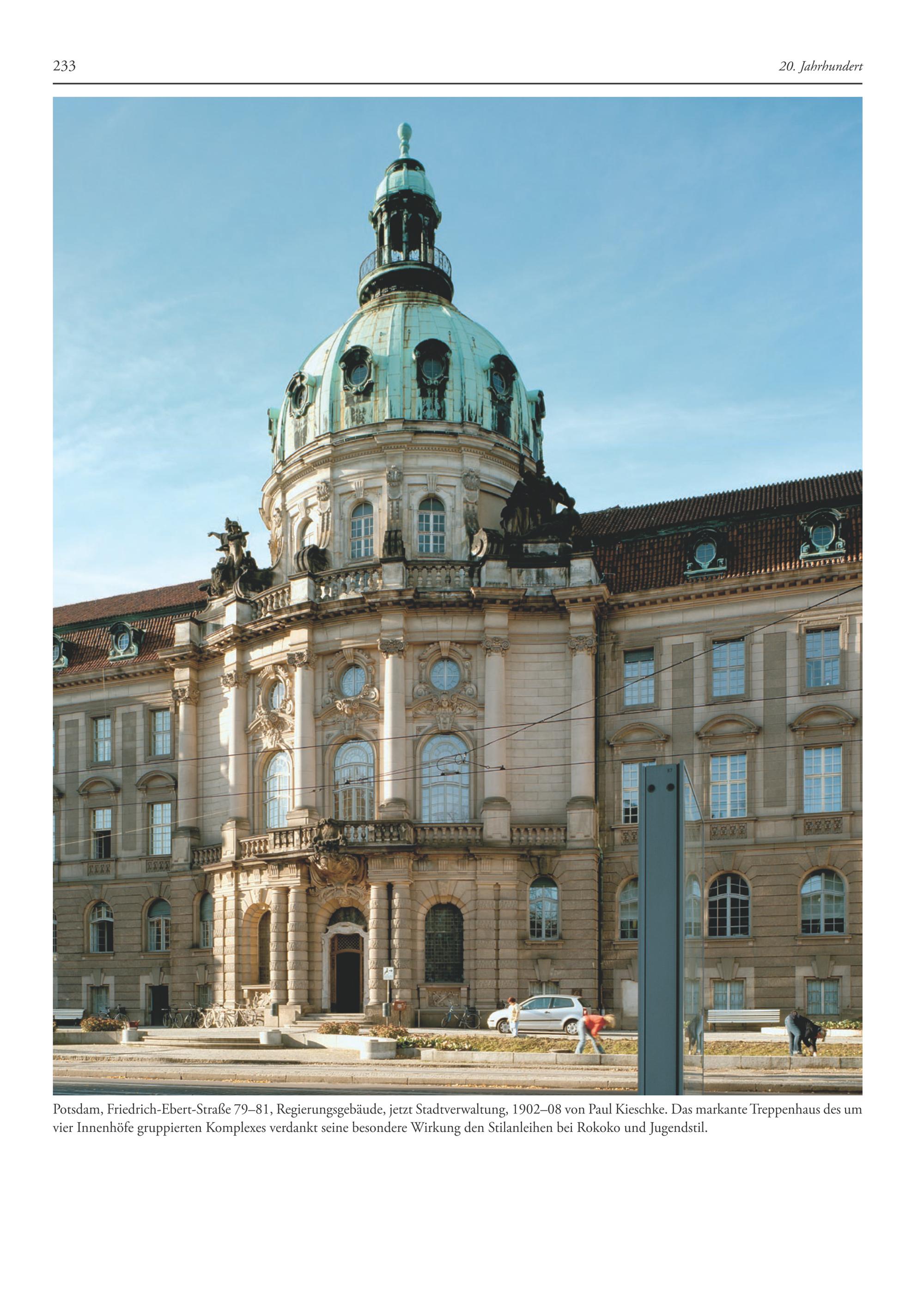 Potsdam, Friedrich-Ebert-Straße 79-81, Regierungsgebäude, jetzt Stadtverwaltung, 1902-08 von Paul Kieschke. Das markante Treppenhaus des um vier Innenhöfe gruppierten Komplexes verdankt seine besondere Wirkung den Stilanleihen bei Rokoko und Jugendstil.