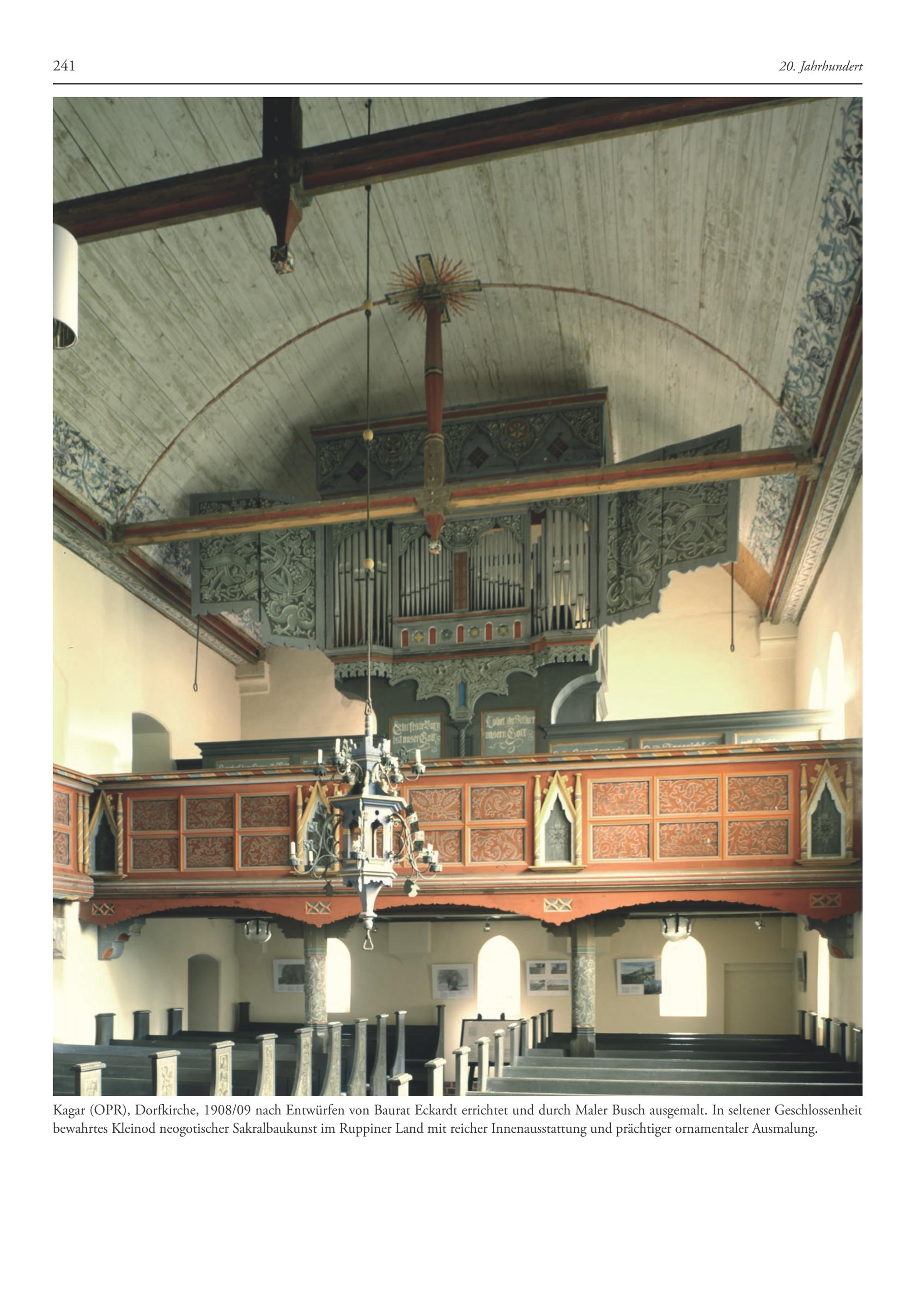 Kagar(OPR), Dorfkirche, 1908/09 nach Entwürfen von Baurat Eckardt errichtet und durch Maler Busch ausgemalt. In seltener Geschlossenheit bewahrtes Kleinod neogotischer Sakralbaukunst im Ruppiner Land mit reicher Innenausstattung und prächtiger ornamentaler Ausmalung.