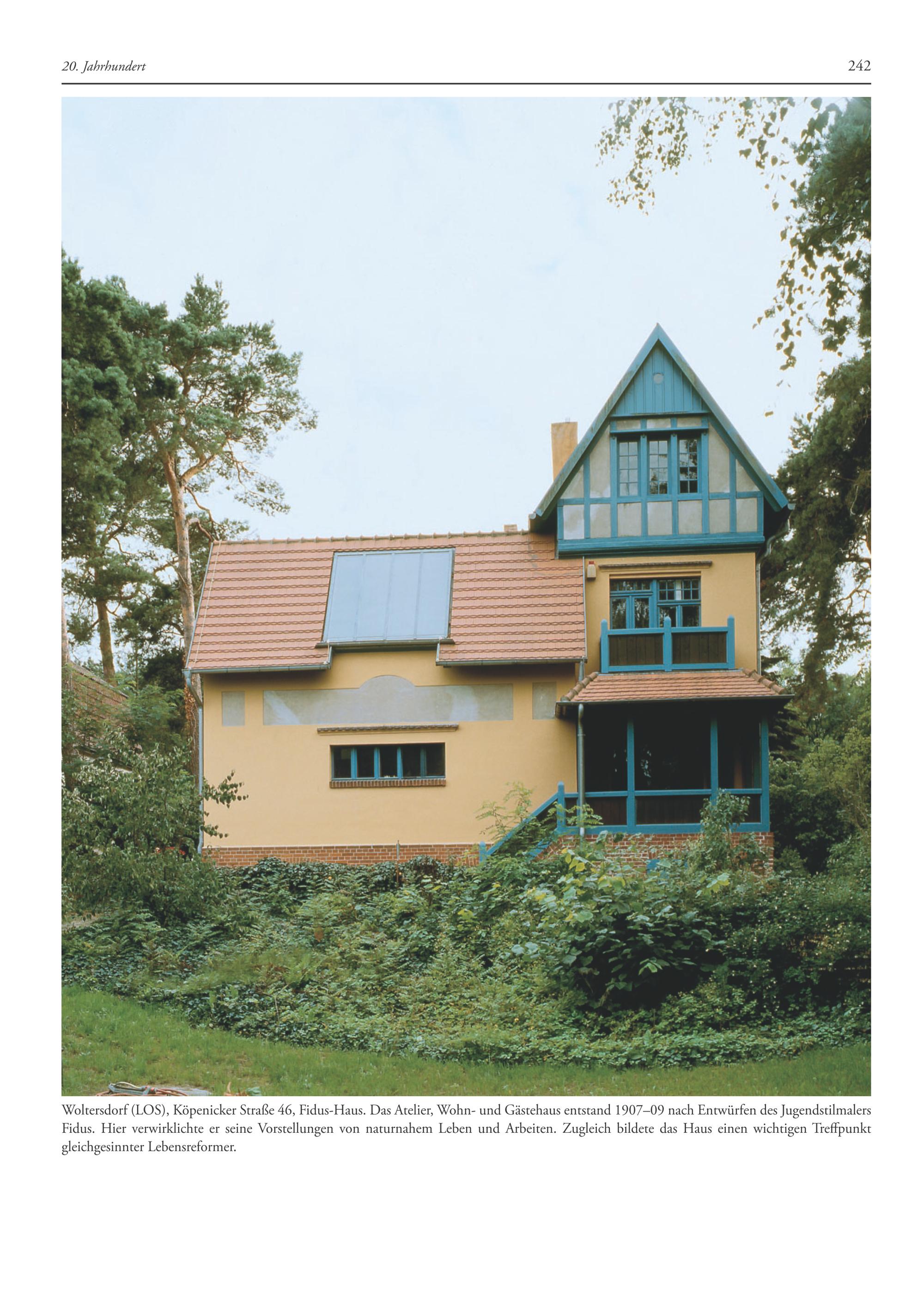 EZ dd— f—# Woltersdorf(LOS), Köpenicker Straße 46, Fidus-Haus. Das Atelier, Wohn- und Gästehaus entstand 1907-09 nach Entwürfen des Jugendstilmalers Fidus. Hier verwirklichte er seine Vorstellungen von naturnahem Leben und Arbeiten. Zugleich bildete das Haus einen wichtigen Treffpunkt gleichgesinnter Lebensreformer.