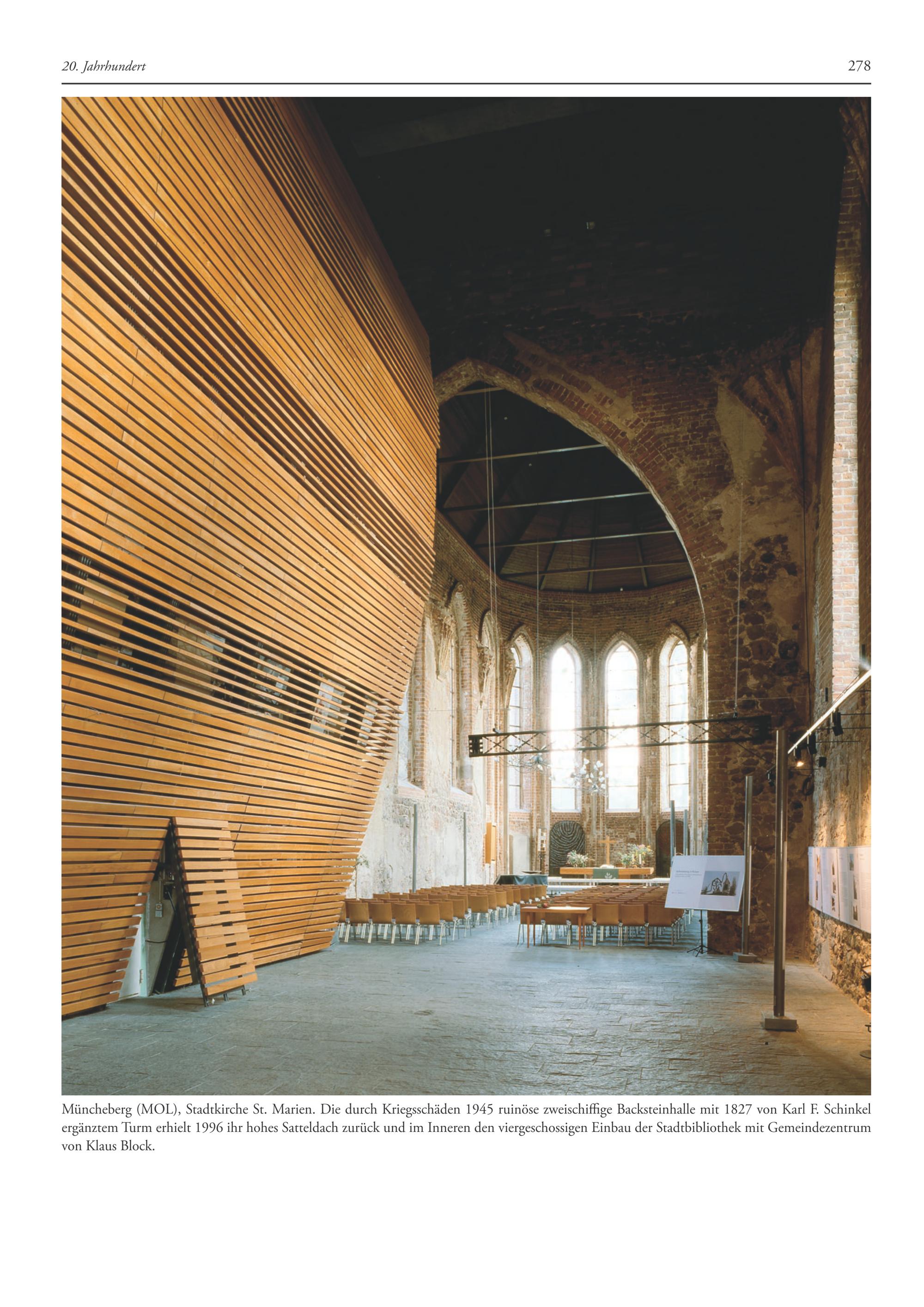 ergänztem Turm erhielt 1996 ihr hohes Satteldach zurück und im Inneren den viergeschossigen Einbau der Stadtbibliothek mit Gemeindezentrum von Klaus Block.