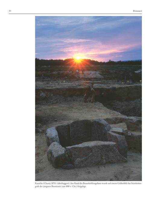 Kausche(Chusej; SPN)(überbaggert). Am Rand des Braunkohletagebaus wurde auf einem Gräberfeld das Steinkistengrab der jüngsten Bronzezeit(um 800 v. Chr.) freigelegt.
