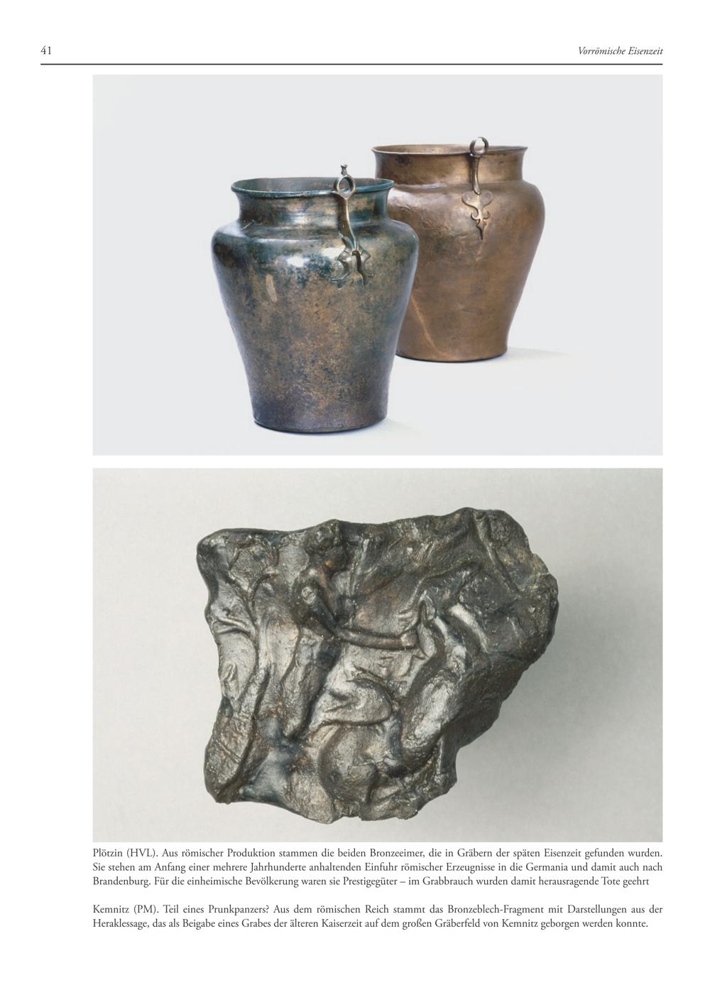 Plötzin(HVL). Aus römischer Produktion stammen die beiden Bronzeeimer, die in Gräbern der späten Eisenzeit gefunden wurden. Sie stehen am Anfang einer mehrere Jahrhunderte anhaltenden Einfuhr römischer Erzeugnisse in die Germania und damit auch nach Brandenburg. Für die einheimische Bevölkerung waren sie Prestigegüter— im Grabbrauch wurden damit herausragende Tote geehrt