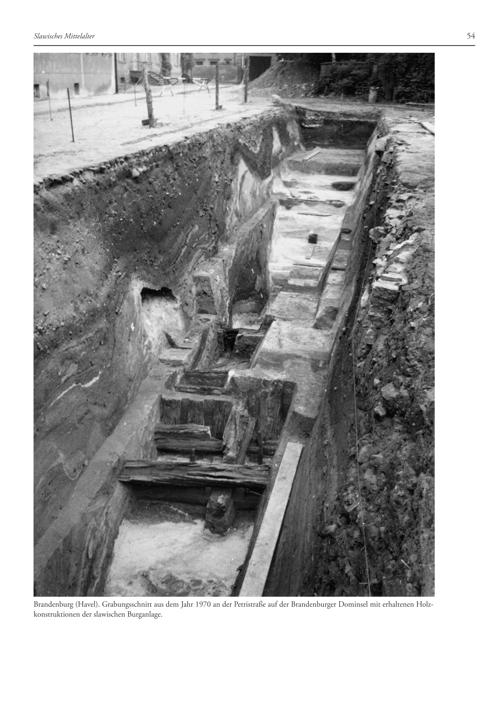 Brandenburg(Havel). Grabungsschnitt aus dem Jahr 1970 an der Petristraße auf der Brandenburger Dominsel mit erhaltenen Holz