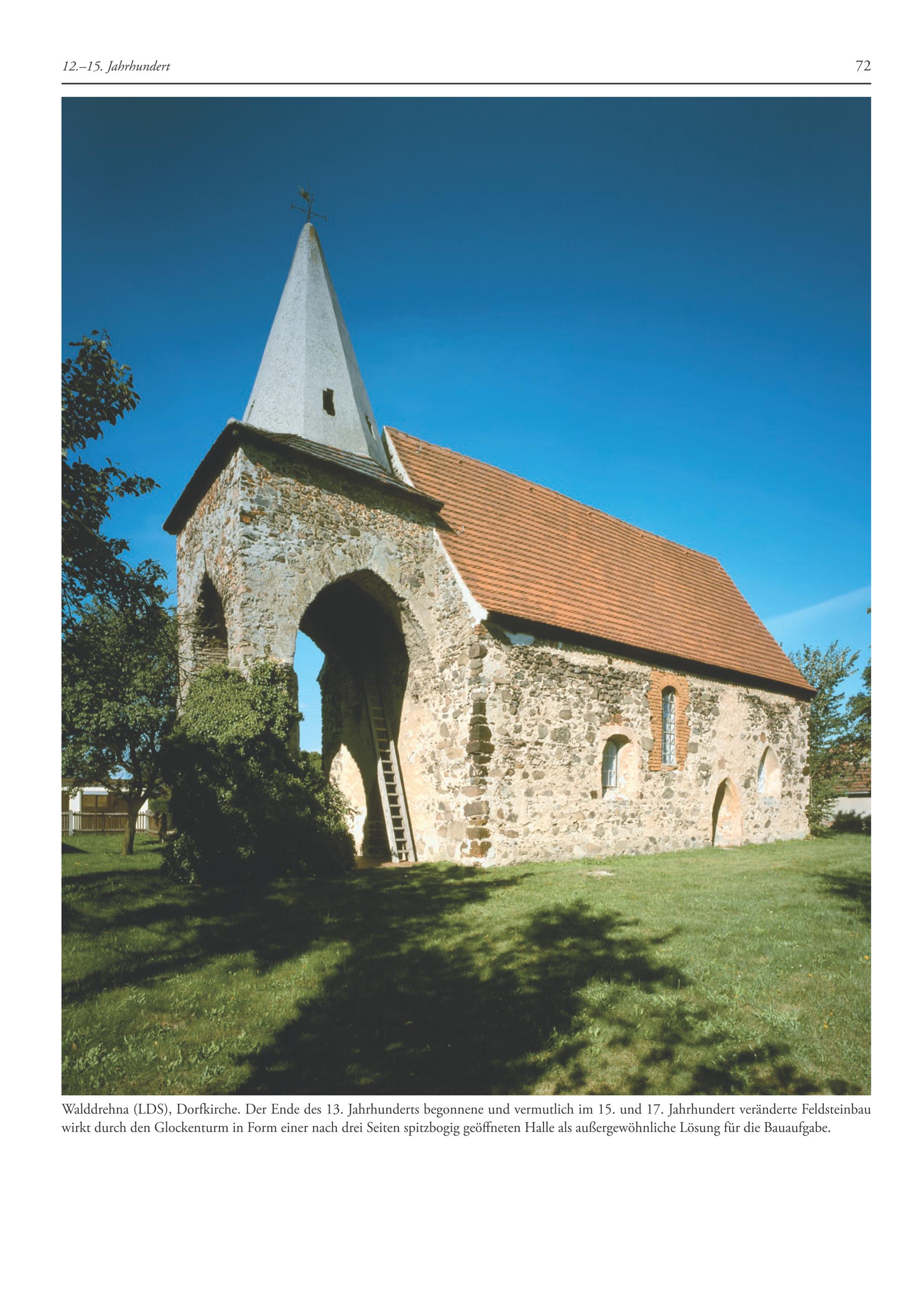 Walddrehna(LDS), Dorfkirche. Der Ende des 13. Jahrhunderts begonnene und vermutlich im 15. und 17. Jahrhundert veränderte Feldsteinbau wirkt durch den Glockenturm in Form einer nach drei Seiten spitzbogig geöffneten Halle als außergewöhnliche Lösung für die Bauaufgabe.