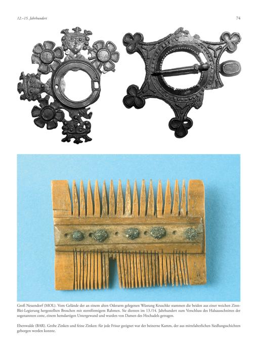 Groß Neuendorf(MOL). Vom Gelände der an einem alten Oderarm gelegenen Wüstung Kruschke stammen die beiden aus einer weichen ZinnBlei-Legierung hergestellten Broschen mit sternförmigem Rahmen. Sie dienten im 13./14. Jahrhundert zum Verschluss des Halsausschnittes der sogenannten cotte, einem hemdartigen Untergewand und wurden von Damen des Hochadels getragen.