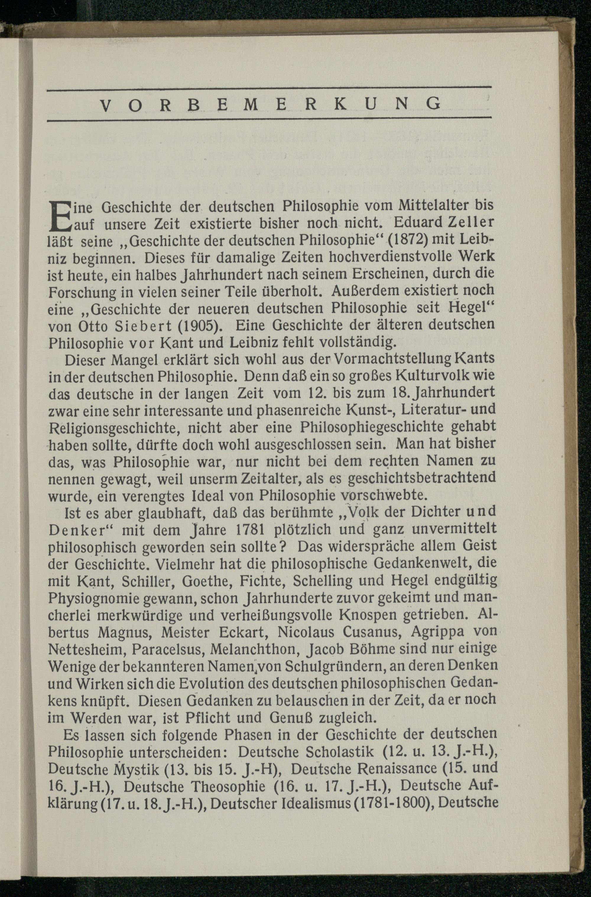 E ine Geschichte der deutschen Philosophie vom Mittelalter bis auf unsere Zeit existierte bisher noch nicht. Eduard Zeller läßt seine „Geschichte der deutschen Philosophie“ (1872) mit Leib- niz beginnen. Dieses für damalige Zeiten hochverdienstvolle Werk ist heute, ein halbes Jahrhundert nach seinem Erscheinen, durch die Forschung in vielen seiner Teile überholt. Außerdem existiert noch eine „Geschichte der neueren deutschen Philosophie seit Hegel“ von Otto Siebert (1905). Eine Geschichte der älteren deutschen Philosophie vor Kant und Leibniz fehlt vollständig.