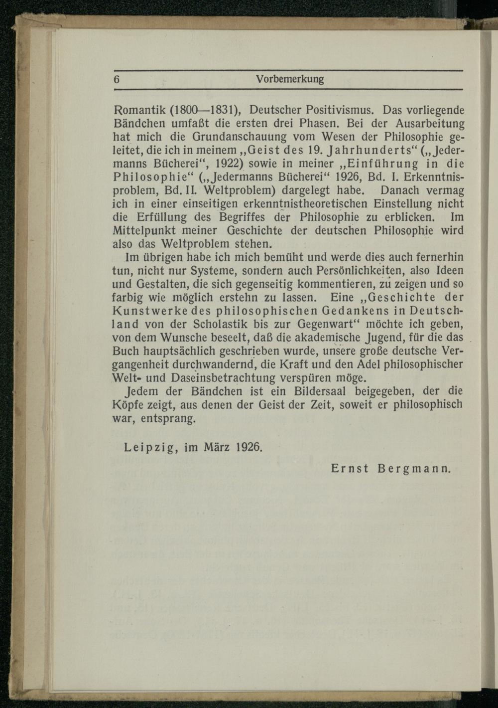 Romantik (1800—1831), Deutscher Positivismus. Das vorliegende Bändchen umfaßt die ersten drei Phasen. Bei der Ausarbeitung hat mich die Grundanschauung vom Wesen der Philosophie geleitet, die ich in meinem „Geist des 19. Jahrhunderts“ („Jedermanns Bücherei“, 1922) sowie in meiner „Einführung in die Philosophie“ („Jedermanns Bücherei“ 1926, Bd. I. Erkenntnisproblem, Bd. II. Weltproblem) dargelegt habe. Danach vermag ich in einer einseitigen erkenntnistheoretischen Einstellung nicht die Erfüllung des Begriffes der Philosophie zu erblicken. Im Mittelpunkt meiner Geschichte der deutschen Philosophie wird also das Weltproblem stehen.