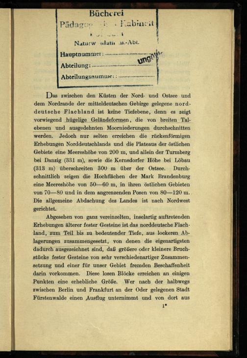 Das zwischen den Küsten der Nord- und Ostsee und dem Nordrande der mitteldeutschen Gebirge gelegene norddeutsche Flachland ist keine Tiefebene, denn es zeigt vorwiegend_hügelige Geländeformen, die von breiten Talebenen und ausgedehnten Moorniederungen durchschnitten werden. Jedoch nur selten erreichen die rückenförmigen Erhebungen Norddeutschlands und die Plateaus der östlichen Gebiete eine Meereshöhe von 200 m, und allein der Turmberg bei Danzig (331 m), sowie die Kernsdorfer Höhe bei Löbau (313 m) überschreiten 30U m über der Ostsee . Durchschnittlich zeigen die Hochflächen der Mark Brandenburg eine Meereshöhe von 50—60 m, in ihren östlichen Gebieten von 70—80 und in dem angrenzenden Posen von 80—120 m. Die allgemeine Abdachung des Landes ist nach Nordwest gerichtet.