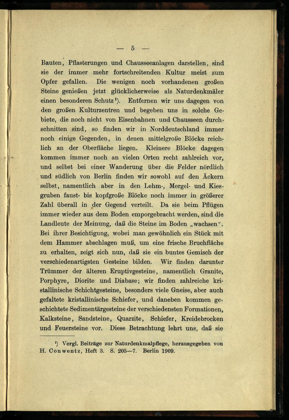 Bauten; Pflasterungen und Chausseeanlagen darstellen, sind sie der immer mehr fortschreitenden Kultur meist zum Opfer gefallen. Die wenigen noch vorhandenen großen Steine genießen jetzt glücklicherweise als Naturdenkmäler einen besonderen Schutz!). Entfernen wir uns dagegen von den großen Kulturzentren und begeben uns in solche Gebiete, die noch nicht von Eisenbahnen und Chausseen durchschnitten sind, so finden wir in Norddeutschland immer noch einige Gegenden, in denen mittelgroße Blöcke reichlich an der Oberfläche liegen. Kleinere Blöcke dagegen kommen immer noch an vielen Orten recht zahlreich vor, und selbst bei einer Wanderung über die Felder nördlich und südlich von Berlin finden wir sowohl auf den Äckern selbst, namentlich aber in den Lehm-, Mergel- und Kiesgruben faust- bis kopfgroße Blöcke noch immer in größerer Zahl überall in der Gegend verteilt. Da sie beim Pflügen immer wieder aus dem Boden emporgebracht werden, sind die Landleute der Meinung, daß die Steine im Boden„wachsen“, Bei ihrer Besichtigung, wobei man gewöhnlich ein Stück mit dem Hammer abschlagen muß, um eine frische Bruchfläche zu erhalten, zeigt sich nun, daß sie ein buntes Gemisch der verschiedenartigsten Gesteine bilden. Wir finden darunter Trümmer der älteren Eruptivgesteine, namentlich Granite, Porphyre, Diorite und Diabase; wir finden zahlreiche kristallinische Schichtgesteine, besonders viele Gneise, aber auch gefaltete kristallinische Schiefer, und daneben kommen ge: schichtete Sedimentärgesteine der verschiedensten Formationen, Kalksteine, Sandsteine, Quarzite, Schiefer, Kreidebrocken