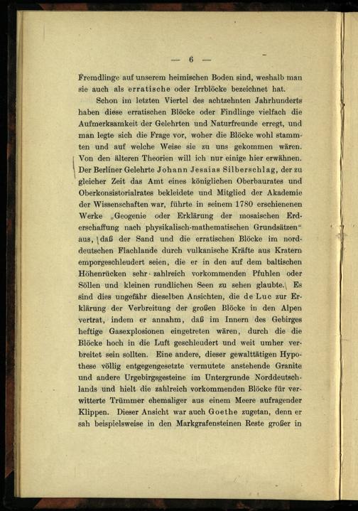 sie auch als erratische oder Irrblöcke bezeichnet hat. Schon im letzten Viertel des achtzehnten Jahrhunderts haben diese erratischen Blöcke oder Findlinge vielfach die Aufmerksamkeit der Gelehrten und Naturfreunde erregt, und man legte sich die Frage vor, woher die Blöcke wohl stammten und auf welche Weise sie zu uns gekommen wären. Von den älteren Theorien will ich nur einige hier erwähnen. Der Berliner Gelehrte Johann Jesaias Silberschlag, der zu