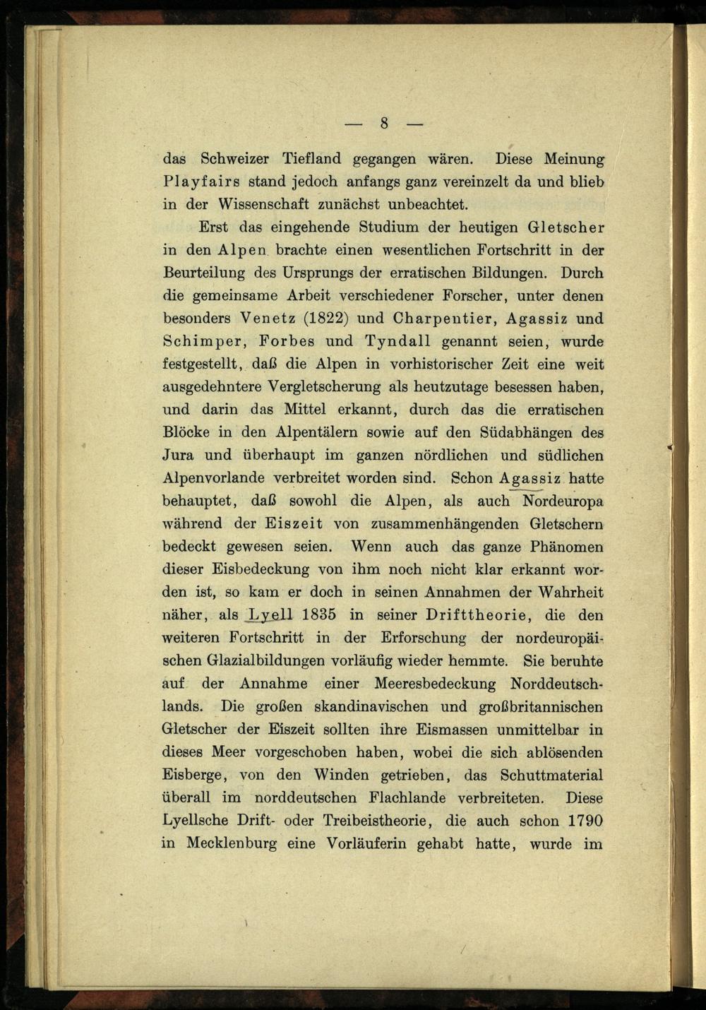 Erst das eingehende Studium der heutigen Gletscher in den Alpen brachte einen wesentlichen Fortschritt in der Beurteilung des Ursprungs der erratischen Bildungen. Durch die gemeinsame Arbeit verschiedener Forscher, unter denen besonders Venetz( 1822) und Charpentier , Agassiz und Schimper, Forbes und Tyndall genannt seien, wurde festgestellt, daß die Alpen in vorhistorischer Zeit eine weit ausgedehntere Vergletscherung als heutzutage besessen haben, und darin das Mittel erkannt, durch das die erratischen Blöcke in den Alpentälern sowie auf den Südabhängen des Jura und überhaupt im ganzen nördlichen und südlichen Alpenvorlande verbreitet worden sind. Schon Agassiz hatte behauptet, daß sowohl die Alpen , als auch Nordeuropa während der Eiszeit von zusammenhängenden Gletschern bedeckt gewesen seien. Wenn auch das ganze Phänomen dieser Eisbedeckung von ihm noch nicht klar erkannt worden ist, so kam er doch in seinen Annahmen der Wahrheit näher, als Lyell 1835 in seiner Drifttheorie, die den weiteren Fortschritt in der Erforschung der nordeuropäischen Glazialbildungen vorläufig wieder hemmte. Sie beruhte auf der Annahme einer Meeresbedeckung Norddeutschlands. Die großen skandinavischen und großbritannischen Gletscher der Eiszeit sollten ihre Eismassen unmittelbar in dieses Meer vorgeschoben haben, wobei die sich ablösenden Eisberge, von den Winden getrieben, das Schuttmaterial überall im norddeutschen Flachlande verbreiteten. Diese Lyellsche Drift- oder Treibeistheorie, die auch schon 1790 in Mecklenburg eine Vorläuferin gehabt hatte, wurde im