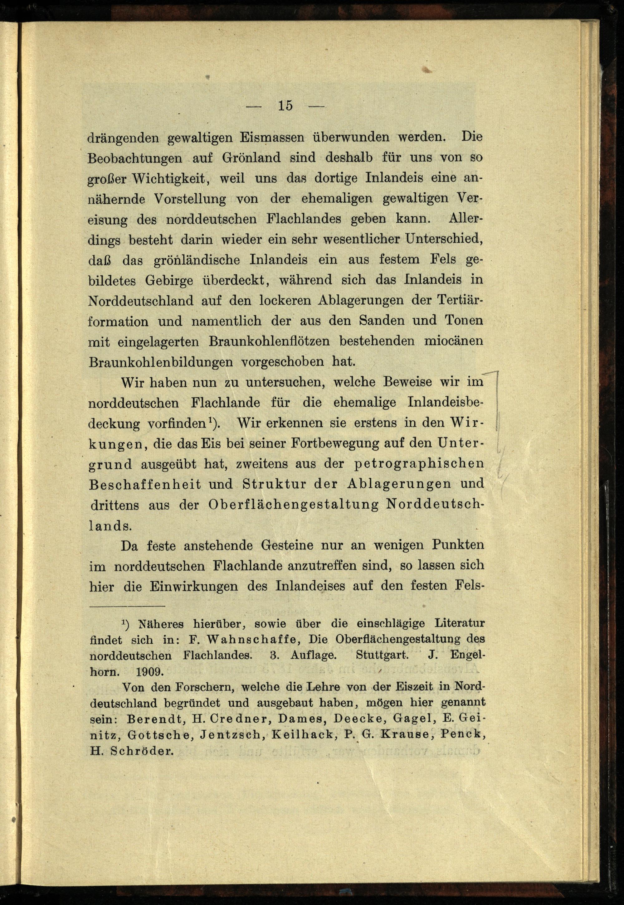 Von den Forschern, welche die Lehre von ‚der Eiszeit in Norddeutschland begründet und ausgebaut haben, mögen hier genannt sein: Berendt, H. Credner, Dames, Deecke, Gagel, E. Geinitz, Gottsche, Jentzsch, Keilhack, P. G. Krause, Penck, H. Schröder.