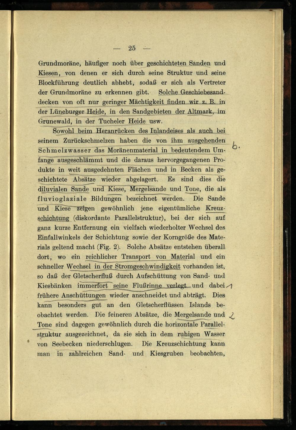 Sowohl beim Heranrücken des Inlandeises als auch bei seinem Zurückschmelzen haben die von ihm ausgehenden Schmelzwasser das Moränenmaterial in bedeutendem Umfange ausgeschlämmt und die daraus hervorgegangenen Produkte in weit ausgedehnten Flächen und in Becken als geschichtete Absätze wieder abgelagert. Es sind dies die diluvialen Sande und Kiese , Mergelsande und Tone, die als fluvioglaziale Bildungen bezeichnet werden. Die Sande und Kiese zeigen gewöhnlich jene eigentümliche Kreuzschichtung( diskordante Parallelstruktur), bei der sich auf ganz kurze Entfernung ein vielfach wiederholter Wechsel des Einfallwinkels der Schichtung sowie der Korngröße des Materials geltend macht( Fig. 2). Solche Absätze entstehen überall dort, wo ein reichlicher Transport von Material und ein schneller Wechsel in der Stromgeschwindigkeit vorhanden ist, so daß der Gletscherfluß durch Aufschüttung von Sand- und Kiesbänken immerfort seine Flußrinne verlegt und dabei frühere Anschüttungen wieder anschneidet und abträgt. Dies kann besonders gut an den Gletscherflüssen Islands beobachtet werden. Die feineren Absätze, die Mergelsande und Tone sind dagegen gewöhnlich durch die horizontale Parallelstruktur ausgezeichnet, da sie sich in dem ruhigen Wasser von Seebecken niederschlugen. Die Kreuzschichtung kann man in zahlreichen Sand- und Kiesgruben beobachten,