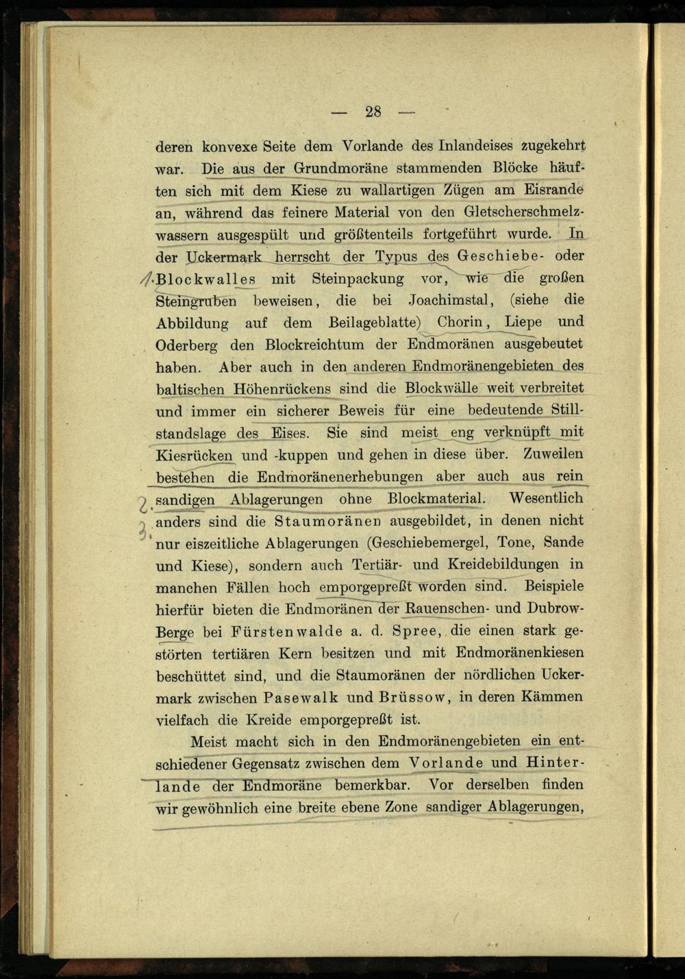 deren konvexe Seite dem Vorlande des Inlandeises zugekehrt war. Die aus der Grundmoräne stammenden Blöcke häuften sich mit dem Kiese zu wallartigen Zügen am Eisrande an, während das feinere Material von den Gletscherschmelzwassern ausgespült und größtenteils fortgeführt wurde. In der Uckermark herrscht der Typus des Geschiebe- oder Blockwalles mit Steinpackung vor, wie die großen Steingruben beweisen, die bei Joachimstal ,( siehe die Abbildung auf dem Beilageblatte) Chorin , Liepe und Oderberg den Blockreichtum der Endmoränen ausgebeutet haben. Aber auch in den anderen Endmoränengebieten des baltischen Höhenrückens sind die Block wälle weit verbreitet und immer ein sicherer Beweis für eine bedeutende Stillstandslage des Eises. Sie sind meist eng verknüpft mit Kiesrücken und-kuppen und gehen in diese über. Zuweilen bestehen die Endmoränenerhebungen aber auch aus rein Wesentlich 2. sandigen Ablagerungen ohne Blockmaterial.