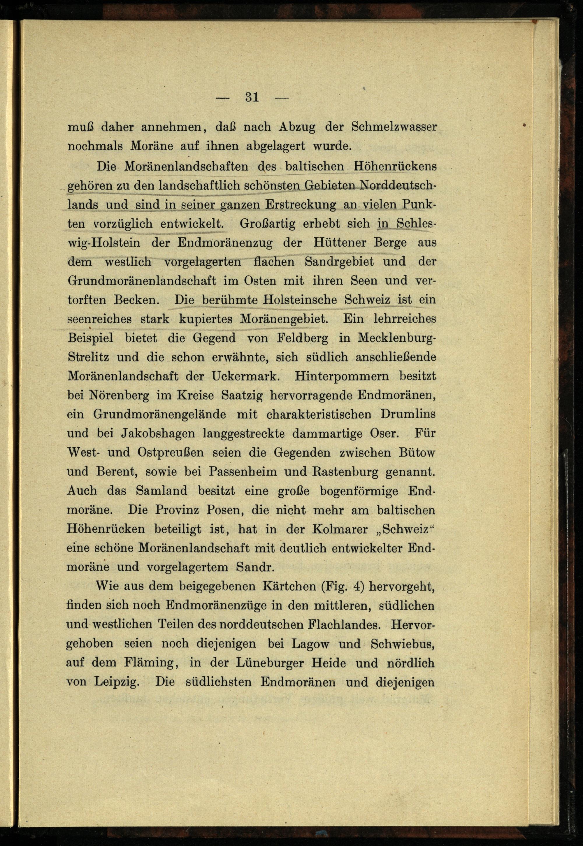 Die Moränenlandschaften des. baltischen Höhenrückens ‚gehören zu den landschaftlich schönsten Gebieten Norddeutschlands und sind in seiner ganzen Erstreckung an. vielen Punkten vorzüglich entwickelt. Großartig erhebt sich in_Schles wig-Holstein der Endmoränenzug der Hüttener Berge aus dem westlich vorgelagerten flachen Sandrgebiet und der Grundmoränenlandschaft im Osten mit ihren Seen und vertorften Becken. Die berühmte Holsteinsche Schweiz ist ein seenreiches stark kupiertes Moränengebiet. Ein lehrreiches Beispiel bietet die Gegend von Feldberg in Mecklenburg = Strelitz