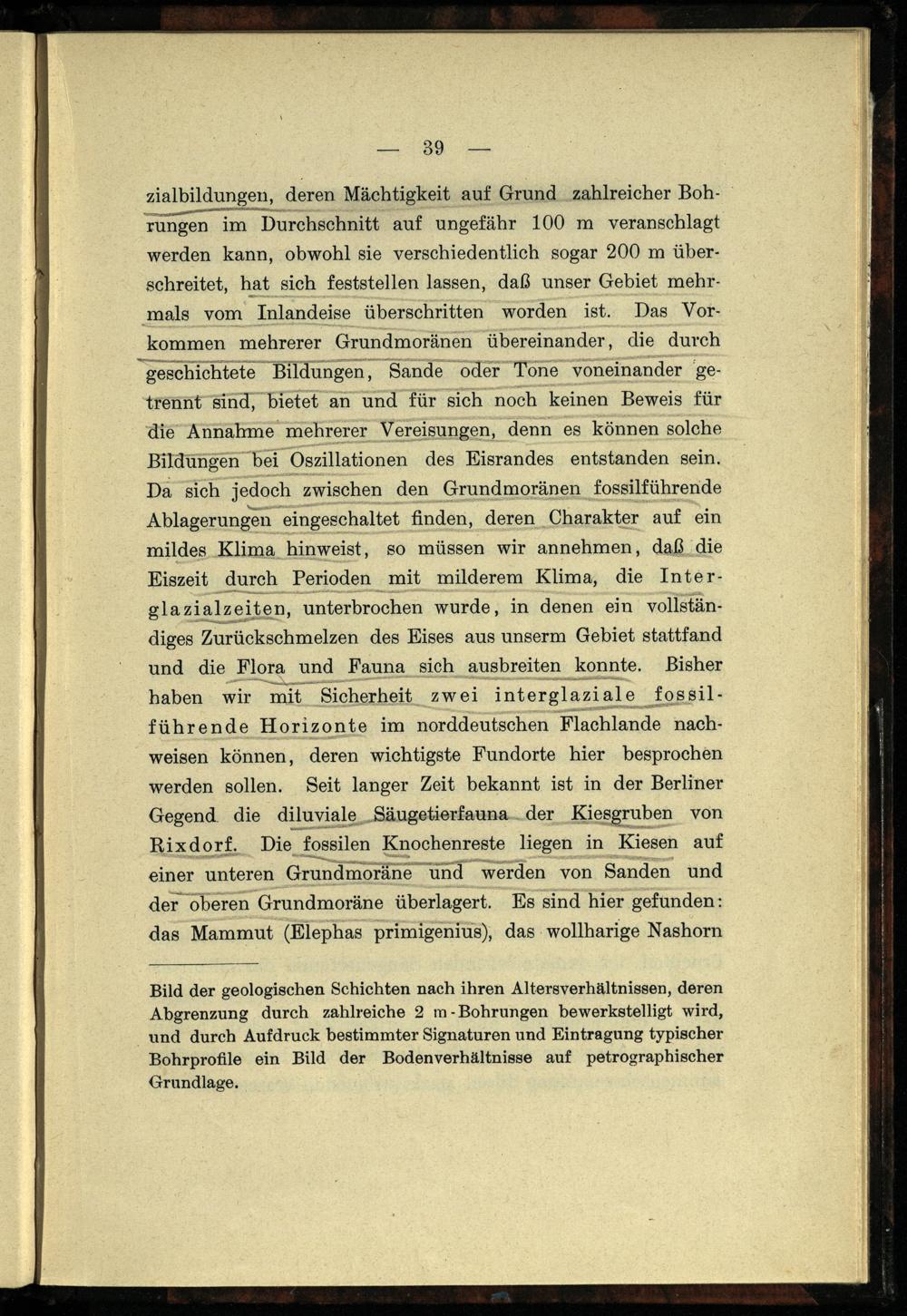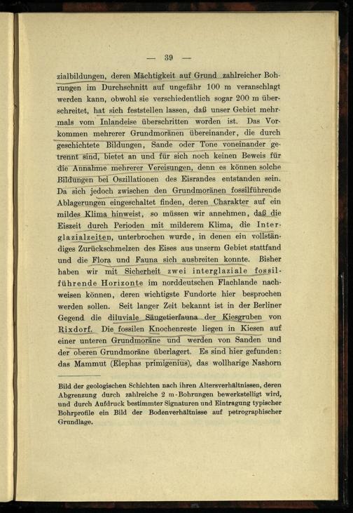 Da sich jedoch zwischen den Grundmoränen fossilführende Ablagerungen eingeschaltet finden, deren Charakter auf ein mildes Klima hinweist, so müssen wir annehmen, daß die Eiszeit durch Perioden mit milderem Klima, die Interglazialzeiten, ‚unterbrochen wurde, in denen ein vollständiges Zurückschmelzen des Eises aus unserm Gebiet stattfand und die Flora und Fauna_ sich ausbreiten konnte. Bisher haben wir mit Sicherheit zwei interglaziale fossilführende Horizonte im norddeutschen Flachlande nachweisen können, deren wichtigste Fundorte hier besprochen werden sollen. Seit langer Zeit bekannt ist in der Berliner Gegend. die diluviale Säugetierfauna. der Kiesgruben von Rixdorf . Die fossilen Knochenreste liegen in Kiesen auf einer unteren Grundmoräne und werden von Sanden und der oberen Grundmoräne überlagert. Es sind hier gefunden: das Mammut(Elephas primigenius), das wollharige Nashorn