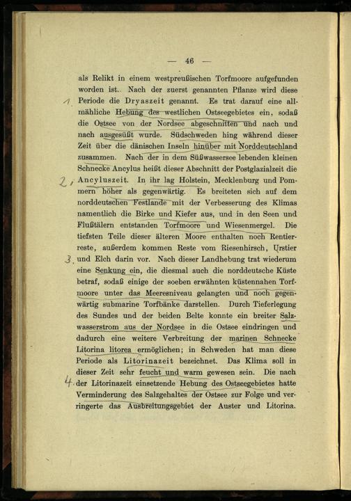 als Relikt in einem westpreußischen Torfmoore aufgefunden worden ist. Nach der zuerst genannten Pflanze wird diese Periode die Dryaszeit genannt. Es trat darauf eine allmähliche Hebung des westlichen Ostseegebietes ein, sodaẞ die Ostsee von der Nordsee abgeschnitten und nach und nach ausgesüẞt wurde. Südschweden hing während dieser Zeit über die dänischen Inseln hinüber mit Norddeutschland zusammen. Nach der in dem Süßwassersee lebenden kleinen Schnecke Ancylus heißt dieser Abschnitt der Postglazialzeit die 2 Ancyluszeit. In ihr lag Holstein, Mecklenburg und Pom mern höher als gegenwärtig. Es breiteten sich auf dem norddeutschen Festlande mit der Verbesserung des Klimas namentlich die Birke und Kiefer aus, und in den Seen und Flußtälern entstanden Torfmoore und Wiesenmergel. Die tiefsten Teile dieser älteren Moore enthalten noch Rentierreste, außerdem kommen Reste vom Riesenhirsch, Urstier 3, und Elch darin vor. Nach dieser Landhebung trat wiederum eine Senkung ein, die diesmal auch die norddeutsche Küste betraf, sodaß einige der soeben erwähnten küstennahen Torfmoore unter das Meeresniveau gelangten und noch gegenwärtig submarine Torfbänke darstellen. Durch Tieferlegung des Sundes und der beiden Belte konnte ein breiter Salzwasserstrom aus der Nordsee in die Ostsee eindringen und dadurch eine weitere Verbreitung der marinen Schnecke Litorina litorea ermöglichen; in Schweden hat man diese Periode als Litorinazeit bezeichnet. Das Klima soll in dieser Zeit sehr feucht und warm gewesen sein. Die nach 4. der Litorinazeit einsetzende Hebung des Ostseegebietes hatte Verminderung des Salzgehaltes der Ostsee zur Folge und verringerte das Ausbreitungsgebiet der Auster und Litorina.