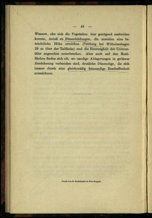 konnte, Anlaß zu Dünenbildungen, die zuweilen eine beträchtliche Höhe erreichen(Püttberg bei Wilhelmshagen 29 m über der Talfläche) und die Eintönigkeit der Urstromtäler angenehm unterbrechen. Aber auch auf den Hochflächen finden sich oft, wo sandige Ablagerungen in größerer Ausdehnung vorhanden sind, deutliche Dünenzüge, die sich immer durch eine gleichmäßig feinsandige Beschaffenheit
