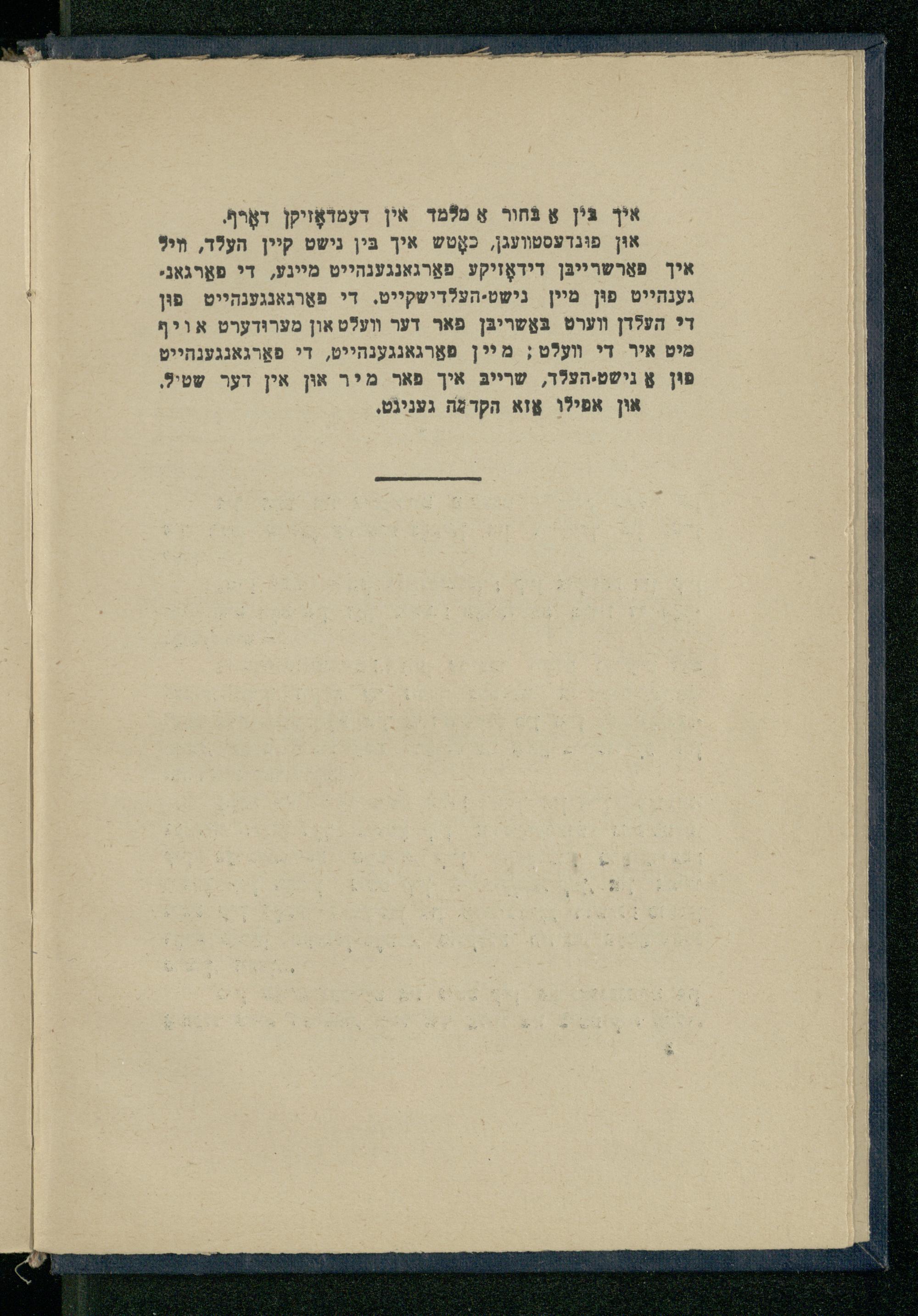 אוּן פוּנדעסטוועגן, כאָטש איך בִּין נישט קיין העלד, װי? איך פאַרשרײיבּן דידאָזיקע פאַרגאנגענהייט מיינע, די פאָרגאג. גענהייט פוּן מיין נישט-העלדישקייט. די פאָרגאנגענהייט פוּן די העלדן וערט בּאַשריבּן פאר דער וועלט און מערוּדערט אויף מיט איר די װעלט; מיין פאַרגאנגענהייט, די פאַרגאנגענהייט פוּן אַ נישט-העלד, שרייבּ איך פאר מיר אוּן אין דער שטיל,