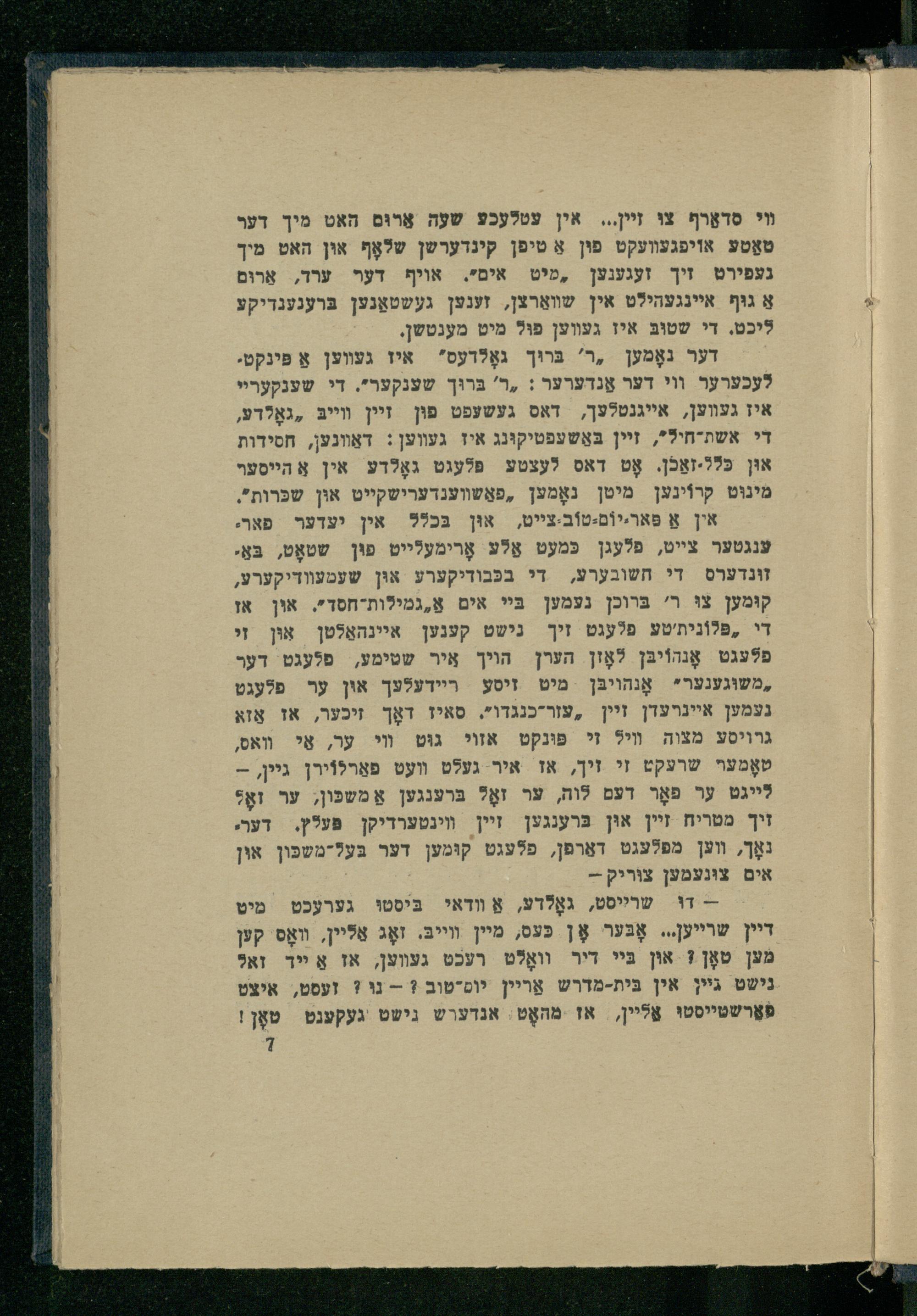 - דוּ שרייסט, גאָלדע, אַ װדאי בּיסטוּ גערעכט מיט דיין שרייען... אָבּער אָן כּעס, מיין וייבּ. זאָג אַלײן, װאָס קען מען טאָן 1 אוּן בּיי דיר וואָלט רעכט געװען, אז אַ יײך זאל נישט גיין אין בּית-מדרש אַריין יוסיטוב?= נוּ? זעסט, איצט פֿאַרשטײסטוּ אַלײן, אז מהאָט. אנדערש נישט געקענט טאָן| 7