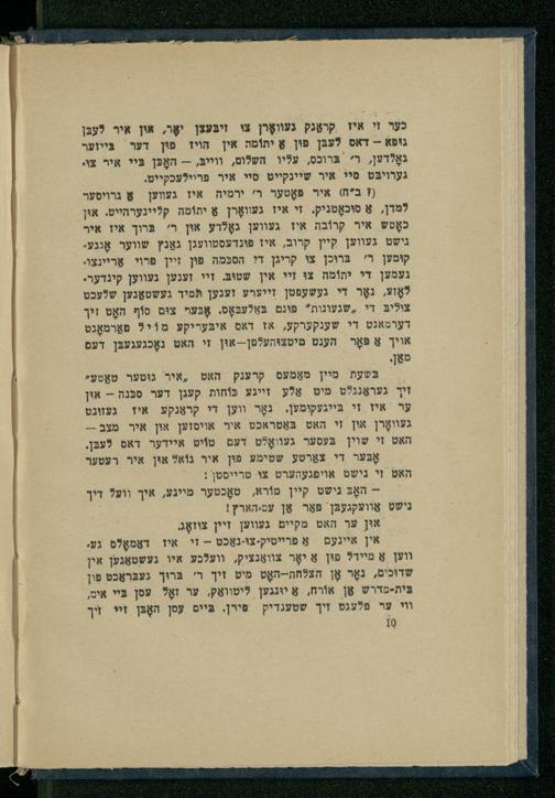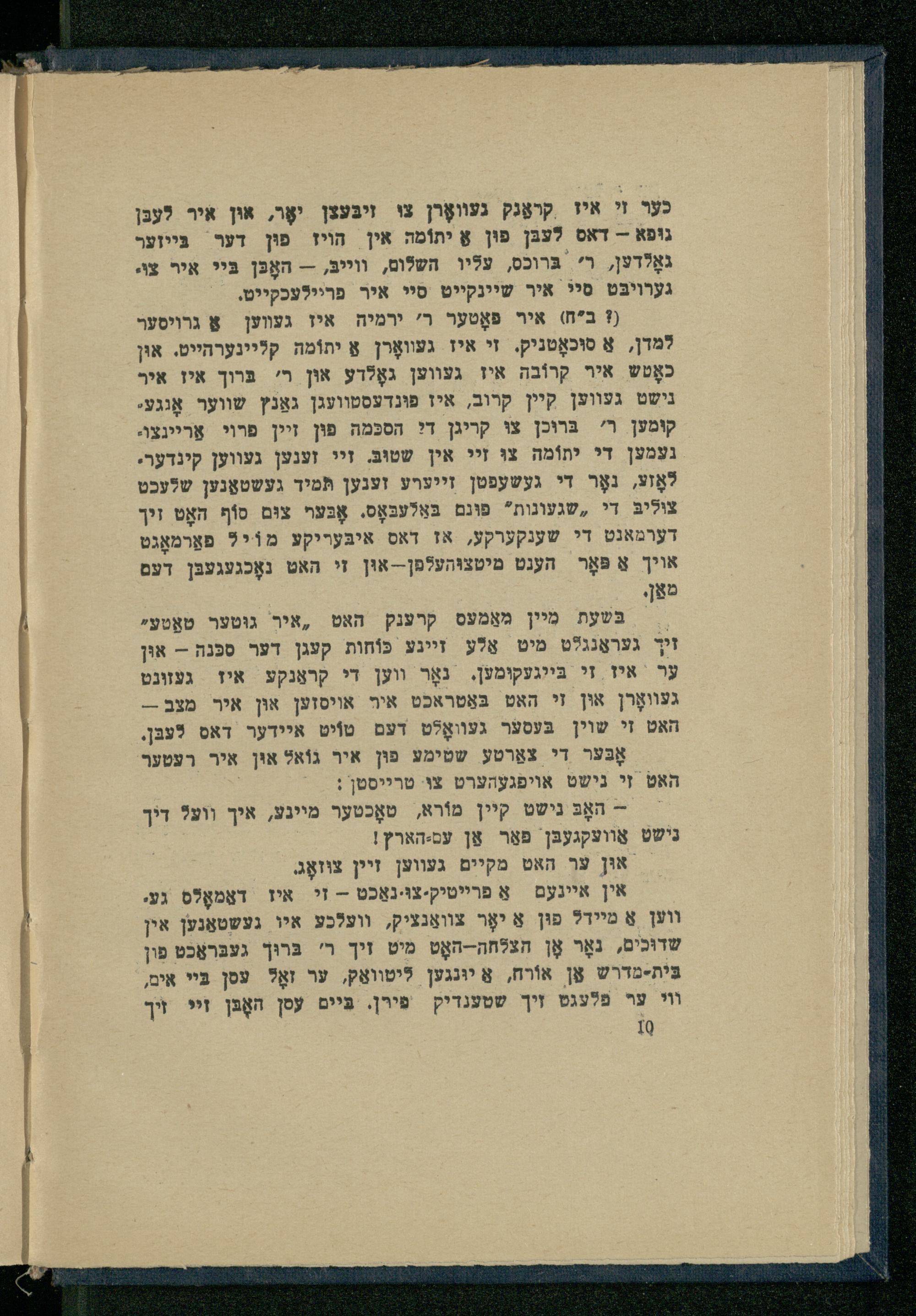אין איינעם אַ פרײטיקיצוּנאַכט- זי איז דאַמאָלס גע. ווען אַ מיידל פוּן אַ יאָר צװאַנציק, וועלכע איו געשטאַנען אין שדוּכים, נאָר אָן הצלחה--האָט מיט זיך ר' בּרוּך געבּראַכט פון בּית-מדרש אַן אוֹרח, אַ יוּנגען ליטוואַק, ער זאָל עסן בֵּיי אים, וי ער פֿלעגט זיך שטענדיק פירן. בַּיים עסן האָבּן זי זיך 0