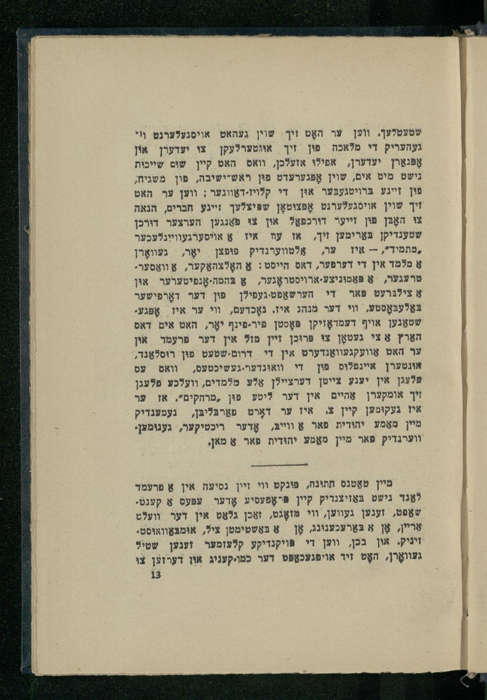 שטעטלעך. ווֹען ער האָט ויך שׁוין געהאט אויסגעלערנט וי געהעריק די מלאכה פוּן זיך אווטערלעקן צו יעדערן און אָפּנאַרן יעדערן, אפילו אזעלכן, וואס האט קיין שוּם שייכות נישט מיט אים, שוין אָפּגערעדט פוּן ראשדישיבה, פון משגיח; פון זיינע בּרױטגעבּער אוּן די קלױז.דאַװנער; ווען ער האט זיך שוין אויסגעלערנט אָפּצוּטאָן שפּיצלעך זיינע חברים, הנאה צו האָבּן פון זײער דורכפאַל און צוּ פּאַנגען הערצער דורכן שטענדיקן בּאַרימען זיך, אז עח איז אַ אױיסערגעווײַנלעכער -מתמיד",-- איז ער, אַלטװערנדיק פופצן יאָר, געװאָרן אַ מלמד אין די דערפער, דאס הייסט: אַ האָלצהאַקער, אַ װאַסער. טרעגער, אַ פֿאַמוּניצע-ארױסטראָגער, אַ בּהמה.אָנפיטערער אוּן אַ צילבּרעט פאר די הערשאַפּטיגעפילן פון דער דאָרפישער בּאַלעבּאָסטע, וי דער מנהג איז. נאָכדעם, וי ער איז אָפּגע. שטאַנען אויף דעמדאָזיקן פּאָסטן פֿיר-פינף יאָר, האט אים דאס האַרץ אַ צי געטאָן צוּ פּרוּכן זיין מז? אין דער פרעמד און ער האט אַװעקגעװאַנדערט אין די דרום.שטעט פון רוּסלאַנד, אונטערן איינפלוס פֿון די ואוּנדער.געשיכטעס, וואס עס פלעגן אין יענע צייטן דערציילן אַלע מלמדים, וועלכע פלעגן זיך אומקערן אַהים אין דער ליטע פוּן ,מרחקים". אז ער איז געקוּמען קיין צ. איז ער דאָרט פאַרבּליבּן, נעמענדיק מיין מאַמע יהודית פאר אַ ווייבּ, אָדער ריכטיקער, גענומען. ווערגדיק פאר מיין מאַמע יהוּדית פאר אַ מאן,