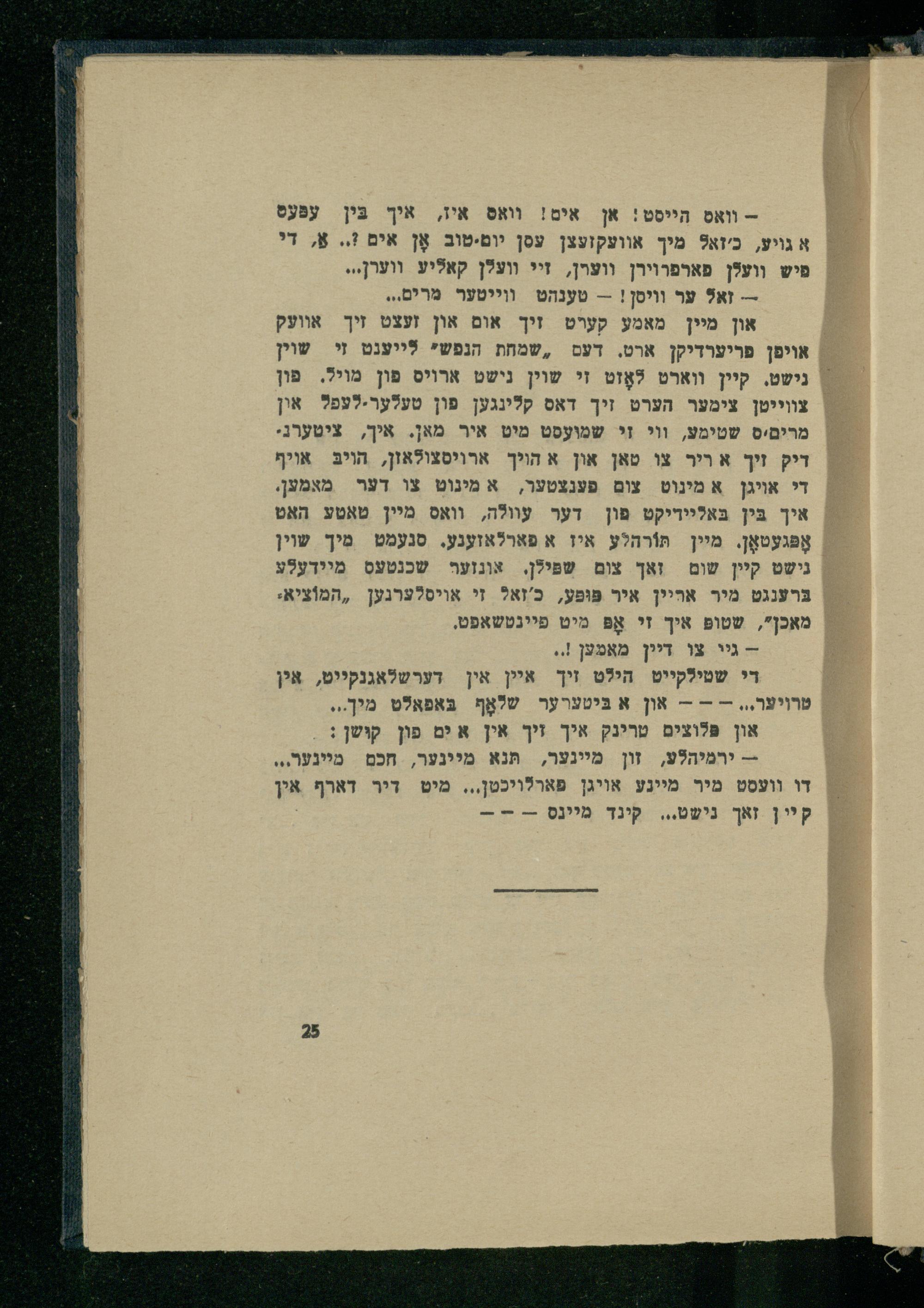 און מיין מאמע קערט זיך אום און זעצט זיך אוועק אויפן פריערדיקן ארט. דעם ,שמחת הנפש" לייענט זי שוין נישט. קיין ווארט לאָזט זי שוין נישט ארויס פון מויל. פון צווייטן צימער הערט זיך דאס קלינגען פון טעלער-לעפל און מריםיס שטימע, וי זי שמועסט מיט איר מאן. איך, ציטערנ. דיק זיך א ריר צו טאן און א הויך ארויסצולאזן, הויבּ אויף די אױגן א מינוט צום פענצטער, א מינוט צו דער מאמען. איך בּין בּאליידיקט פון דער עוולה, וואס מיין טאטע הָאט אָפּגעטאָן. מיין תּוֹרהלע איז א פארלאזענע. סנעמט מִיך שוין גישט קיין שום ואך צום שפּילן. אונזער שכנטעס מיידעלע בּרענגט מיר אריין איר פּוּפּע, כ'זאל זי אויסלערגען ,המוֹציא מאכן", שטופ איך זי אָפּ מיט פיינטשאפט,