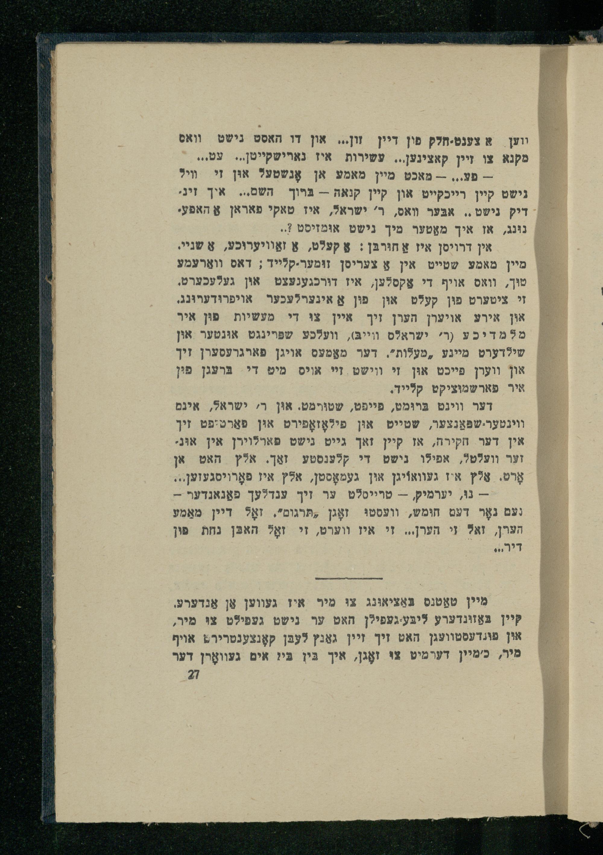 -- פע...-- מאכט מיין מאמע אן אָנשטעל און זי װיל נישט קיין רייכקייט און קיין קנאה-- בּױוך השם... איך וינ דיק נישט.. אבּער ואס, ר' ישראל, איז טאקי פאראן אַ האפעי נוּנג, אז איך מאַטער מיך נישט אוּמזיסט?..