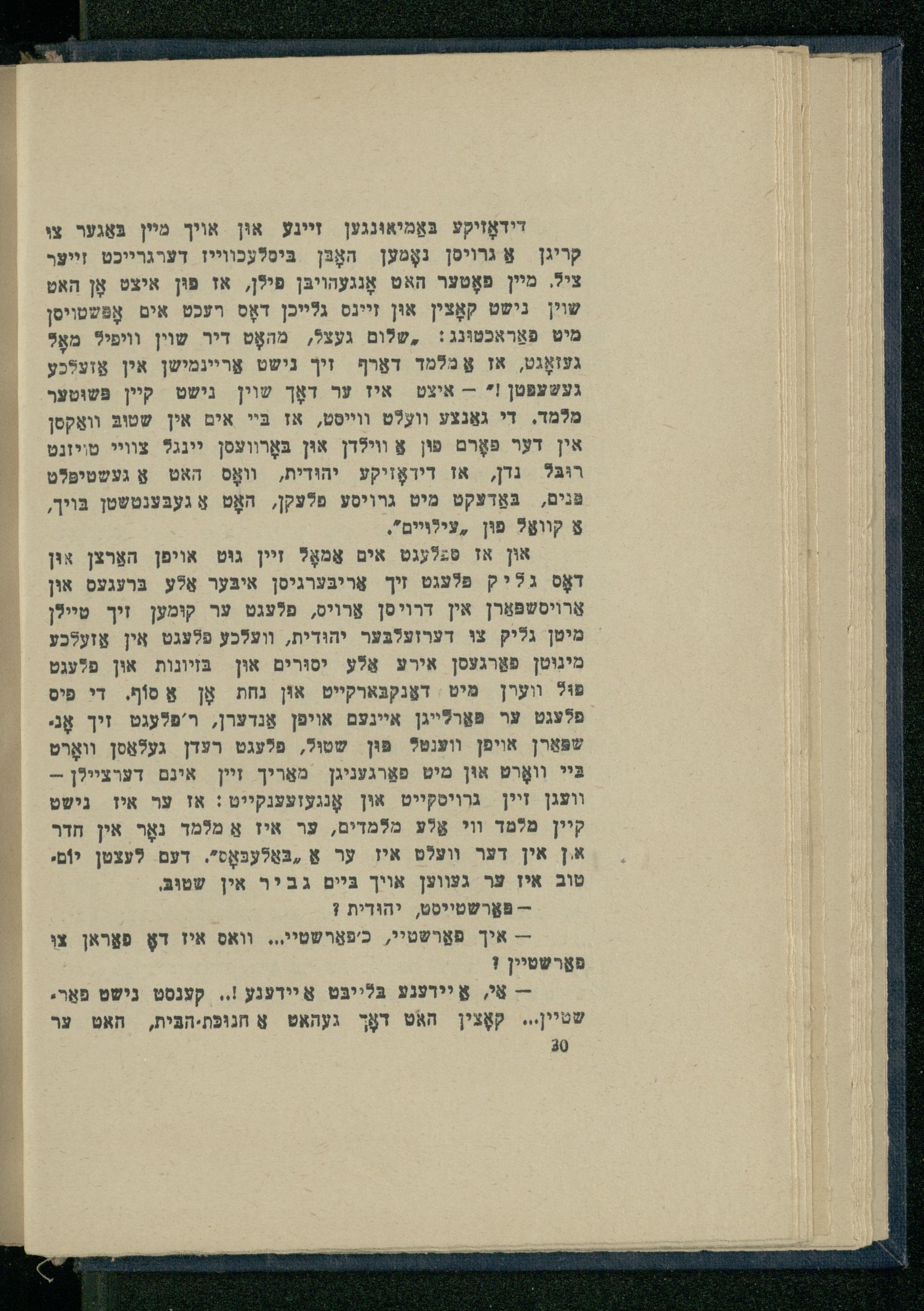 אוּן אז סעלעגט אים אַמאָל זיין גוּט אויפן האַרצן אוּן דאָס גליק פּלעגט זיך אַריבּערגיסן איבּער אַלע בּרעגעס אוּן אַרױסשפּאַרן אין דרויסן אַרױס, פלעגט ער קוּמען זיך טיילן מיטן גליק צו דערזעלבער יהוּדית, וועלכע פלעגט אין אַזעלכע מיגוטן פאַרגעסן אירע אַלע יסוּרים אוּן בּזיונות און פלעגט פּוֹל װערן מיט דאַנקבּארקייט אוּן נחת אָן אַ סוֹף. די פיס פלעגט ער פּאַרלײגן איינעם אױיפן אַנדערן, ר'פלעגט זיך אָג. שפּאַרן אויפן ווענט?ל פון שטו?, פלעגט רעדן געלאַסן װאָרט בּיי װאָרט אוּן מיט פאַרגעניגן מאַריך זיין אינם דערציילן-וועגן זיין גרויסקייט אוּן אָנגעזעענקייט: אז ער איז גישט קיין מלמד וי אַלע מלמדים, ער איז אַ מלמך נאָר אין חדר אן אין דער וװעלט איז ער א ,בּאַלעבּאָס". דעם לעצטן יוֹם. טוב איז ער געווען אויך בּיים גביר אין שטוּבּ,