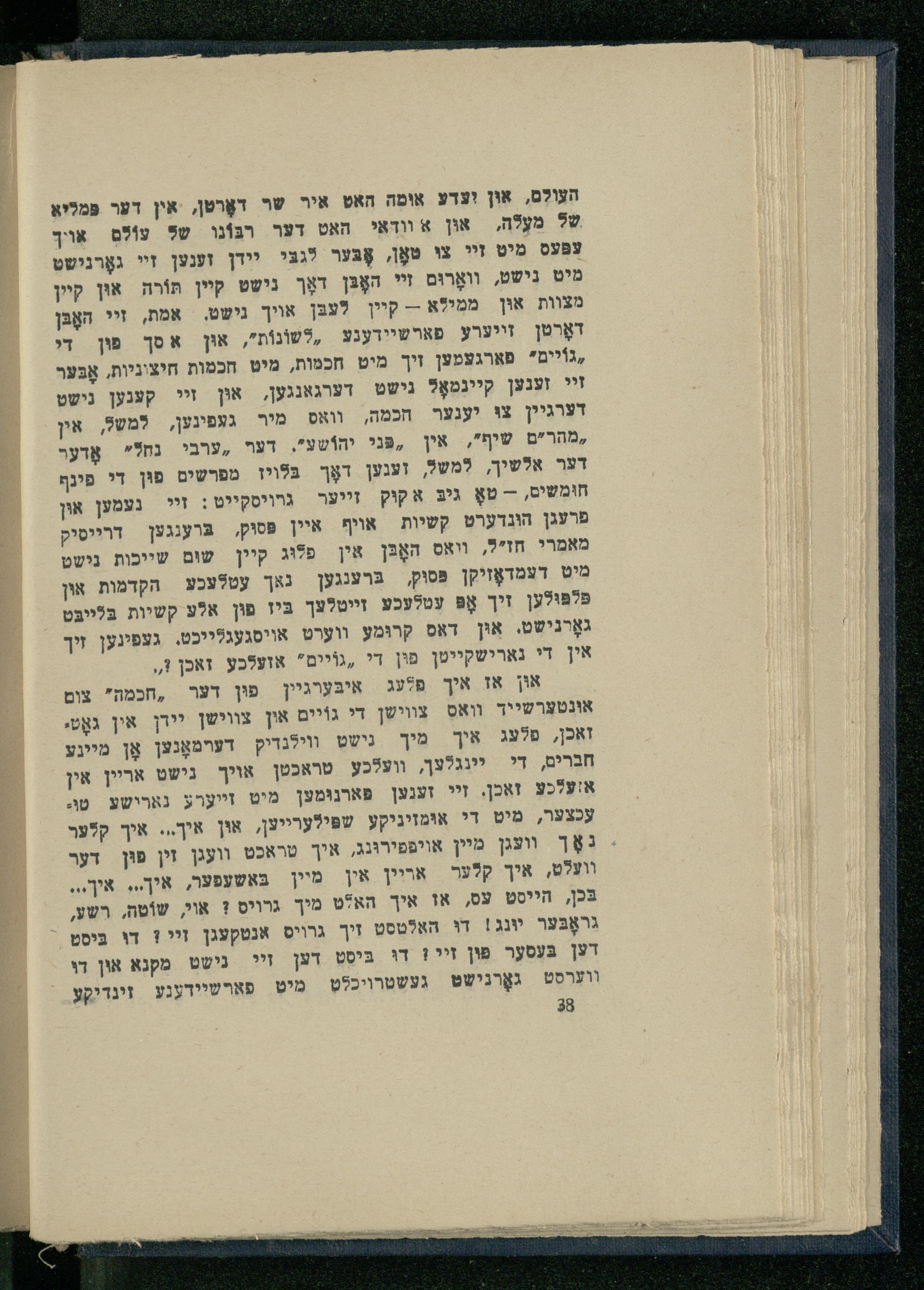 העוֹלִם, אוּן ידע אומה האט איר שר דאָרטן, אין דער פּמליא של מעלה, און א וודאי האט דער רבּוֹנו של עוֹלם אויך עפּעס מִיט זי צי טאָן, אָבער לגבי יידן זענען זי גאָרנישט מיט נישט, װאָרוּם זי האָבּן דאָך נישט קיין תּוֹרה אוּן קיין מצוות אוּן ממילא-- קיין לעבּן אויך גישט. אמת, זיי האָבּן דאָרטן זייערע פארשיידענע לשוֹנוֹת", אוּן א סך פון די ;גוֹיים" פארגעמען זיך מיט חכמות, מיט חכמות חיציניות, אָבּער זי זענען קייגמאָל נישט דערגאנגען, אוּן זיי קענען נישט דערגיין צו יענער חכמה, וואס מיר געפינען, למשל, אין ;מהר"ם שיף", אין ,פַּני יה!שע", דער ,ערבי נחל" אָדער דער אלשיך, למשל, זענען דאָך בּלױן מפרשים פוּן די פינף חוּמִשים,- טאָ גיב א קוק זייער גױויסקייט: זי נעמען אין פרעגן הונדערט קשיות אויף איין פּסוק, ברענגען דרייסיק מאמרי חז"ל, ואס האָבּן אין פלוּג קיין שוּם שייכות נישט מיט דעמדאָזיקן פֵּסוּץ, בּרענגען נאך עטלעכע הקדמות און פּלפולען זיך אָפּ עטלעכע זייטלעך בּיז פוּן אלע קשיות בּלייבּט גאָרנישט. אוּן דאס קרוּמעץ ווערט אויסגעגלייכט. געפינען זיך אין די נארישקייטן פוּן די ,גוֹיים" אועלכע זאכן?,,