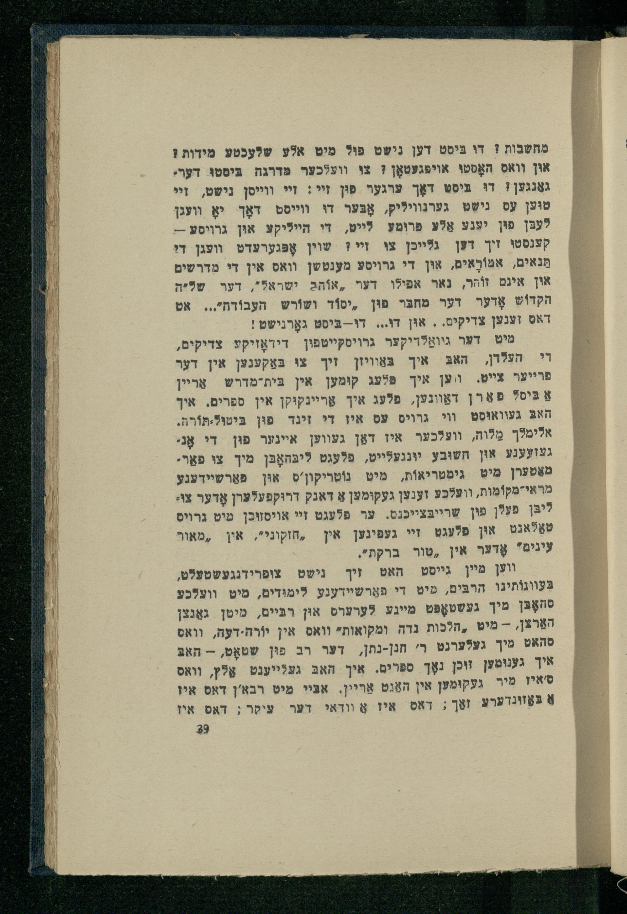 מחשבות? דו בּיסט דען נישט פו? מיט אלע שלעכטע מידות! און וואס האָסטוּ אױיפגעטאָן? צו וועלכער פּדרגה בִּיסטוּ דער. גאַנגען! די ביסט דאָך ערגער פוּן זײ: זי ווייסן נישט, זײי טוּען עס גישֵט גערנוויליק, אָבֶּער דו ווייסט דאָך יאָ וועגן לעבּן פוּן יענע אַלע פרומע לייט, די הייליקע אוּן גרויסע-קענסטו זיך דען גלייכן צו זײ? שוין אָפּגערעדט וועגן די ַּנאים, אִמּוֹרָאִים, אוּן די גרויסע מענטשן וואס אין די מדרשים און אינם זוֹהר, נאר אפילו דער ,אוֹהב2 ישראל", דער שליה הקְדוֹש אָדער דער מחבַּר פוּן ,יסוֹד ושוֹרש העבוֹדה",.. אט דאס זענען צדיקים.. אוּן דו... דו--בּיסט גאָרנישט!