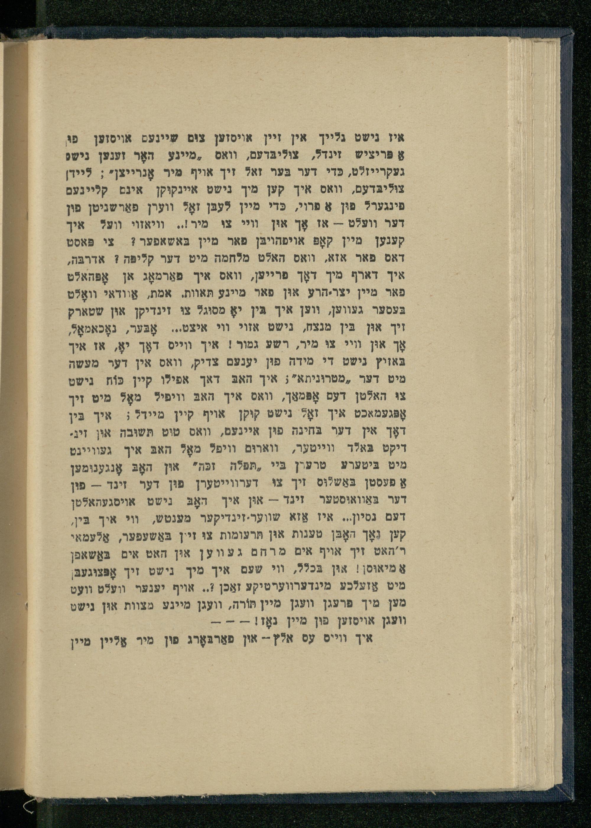 איז נישט גלייך אין זיין אויסזען צום שיינעם אויסזען פוּ, אַ פּריציש זינדל, צוליבּרעם, וואס ,מיינע האָר זענען נישס געקרייזלט, כּדי דער בּער זאל זיך אויף מיר אָנרייצן"; ליידן צוּליבּדעם, וואס איך קען מיך נישט איינקוקן אינם קליינעם פינגערל פוּן אַ פרוי, כּדי מיין לעבּן זאָל ווערן פאַװשניטן פון דער וועלט-- אז אָך אוּן וויי צו מיר!.. וויאזוי װעל איך קענען מיין קאָפּ אויפהויבּן פאר מיין באשאפער? צי פּאסט דאס פאר אזא, וואס האלט מלחמה מיט דער קליפה? אדרבּה, איך דארף מיך דאָך פרייען, וואס איך פאַרמאָג אן אָפּהאלט פאר מיין יצר.הרע אוּן פאר מיינע תּאוות. אמת, אַוודאל װאָלט בּעסער געווען, ווען איך ּין יאָ מסוג? צוּ זינדיקן און שטארק זיך אוּן בּין מנצח, נישט אזוי וי איצט... אָבּער, נאָכאמאָל, אָך אוּן וויי צוּ מיר, רשע גמור! איך ווייס דאָך יאָן אז איך בּאויץ נישט די מידה פוּן יענעם צדיק, וואס אין דער מעשה מיט דער ,מטרוניתא"; איך האבּ דאך אפילו קיין כּוֹת נישט צוּ האלטן דעם אָפּמאַן, וואס איך האבּ וויפי? מאָל מיט זיך אָפּגעמאכט איך זאָל נישט קוקן אויף קיין מייד?; איך בִּין דאָך אין דער בּחינה פוּן איינעם, וואס טוט תּשוּבה אוּן זיג. דיקט בּאלד ווייטער, ווארים וויפל? מאָל האבּ איך געוויינט מיט בּיטערע טרערן בי ,תּפלה זכּה" אוּן האָבּ אָנגענומען אַ פעסטן בּאַשלוּס זיך צוּ דערווייטערן פוּן דער זינד-- פון דער בּאַוואוּסטער זינד-- און איך האָב נישט אויסגעהאלטן דעם גסיון... איז אַוא שווער-זינדיקער מענטש, וי איך בּין, קען נאָך האָבּן טענות אוּן תּרעומות צוּ זיין בּאַשעפער, אַלעמאִי ר'האט זיך אויף אים מרהם געװען אוּן האט אים בּאַשאפן אַ מיאוסן! אוּן בּכלל, וי שעם איך מיך נישט ויך אָפּצוּגעבּן מיט אַזעלכע מינדערווערטיקע זאַפן?.. אויף יענער וועלט וועט מען מיך פרעגן וועגן מיין תּוֹרה, וועגן מיינע מצוות אוּן נישט וועגן אויסזען פון מיין נאָז!--