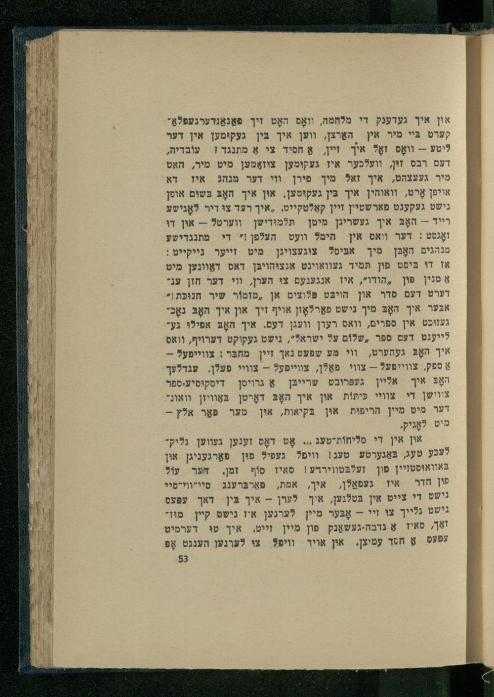 און אין געדענק די מלחמה, װאָס האָט זיך פאַנאַנדערגעפלאַקערט בי מיר אין האַרצן, ווען איך בּין געקוּמען אין דער ליטע-- װאָס זאָל איך זיין, אַ חסיד צי אַ מתנגד! עוֹבדיה, דעם רבס זון, וועלכער איז געקומען צוזאַמען מיט מיר, האט מיר געעצהט, איך זאל מיך פירן וי דער מנהג איז דא אויפן אָרט, וואוהין איך בּין געקומען, און איך האָבּ בּשוּם אופן נישט געקענט פארשטיין זיין קאַלטקייט. ,איך רעד צוּ דיר לאָגישע ריד-- האָבּ איך געשריגן מיטן תּלמוּדישן ווערט?-- און דו זאָגסט: דער וואס אין הימל וועט העלפן!* די מתנגדישע מנהגים האָבּן מיך אביסל צוגעצויגן מיט זייער נייקייט: אז דוּ בּיסט פון תּמיד געוואוינט אנצוּהויבּן דאס דאַװנען מיט אַ מנין פון ,הודו", איז אנגענעם צוּ הערן, ווי דער חון עגדערט דעם סדר און הויבּט פּלוצים אן ,מזמוֹר שיר חנוכת!* אבּער איך האָבּ מיך נישט פאַר?אָזן אויף זיך און איך האָבּ נאָכגעזוּכט אין ספרים, וואס רעדן וועגן דעם. איך האָבּ אפילוּ גע לייענט דעם ספר ,שלוֹם על ישרא?", נישט געקוקט דערויף, וואס איך האָבּ געהערט, ווי מע שפעט נאך זיין מחבּר: צווייפעל-8 ספק, צווייפעל-- צווי פאַלן, צווייפעל-- צוויי פעלן. ענדלעך האָבּ איך אליין געפּרובט שרייבּן אַ גרויסן דיסקוּסיע:ספר ציוישן די צוויי כִּיתּוֹת און איך האָבּ דאָרטן בּאַויזן וואונדער מיט מיין הריפות אוּן בַּקִיאות, און מער פאַר אלץ מיט לאָגיק.