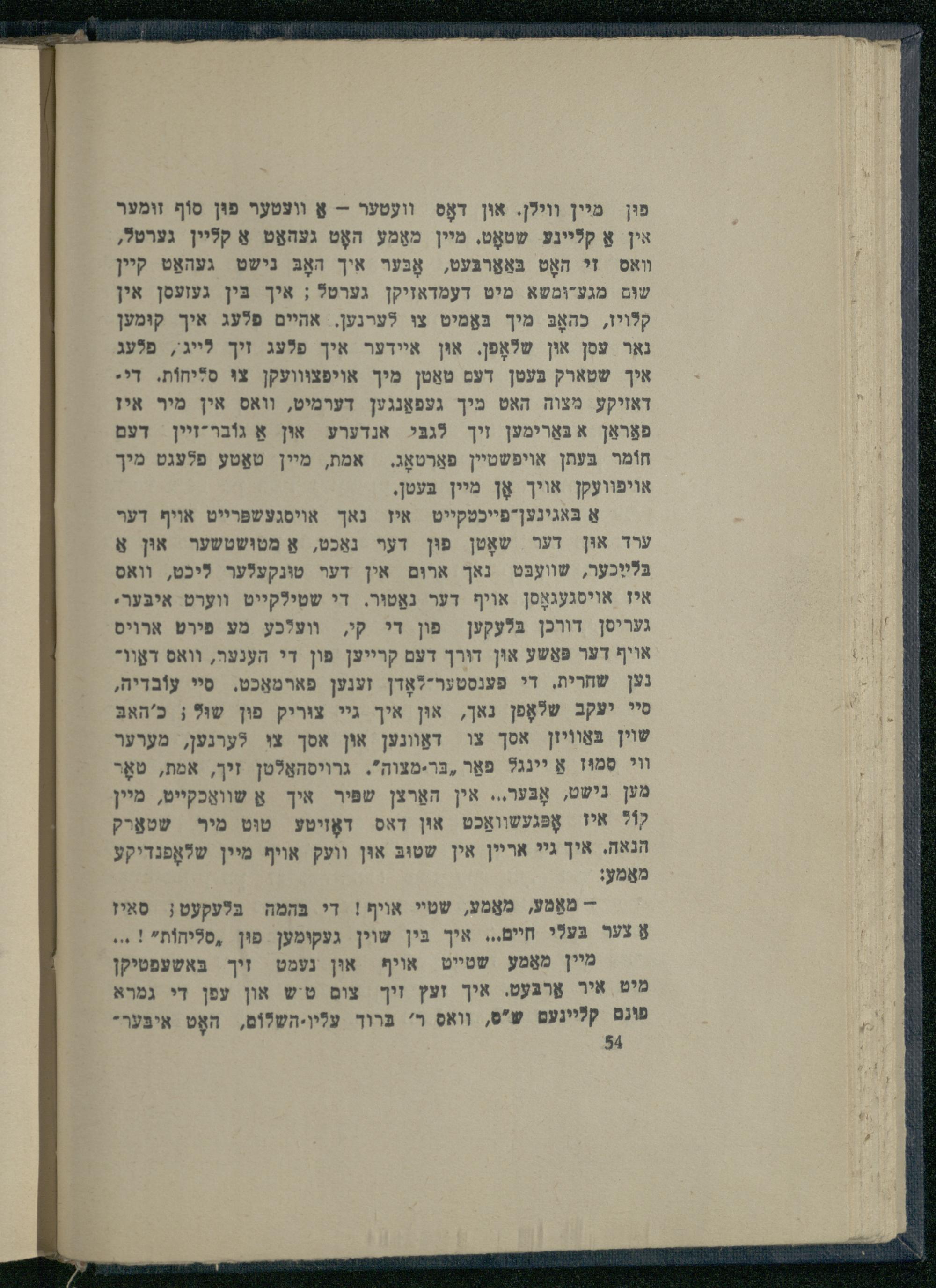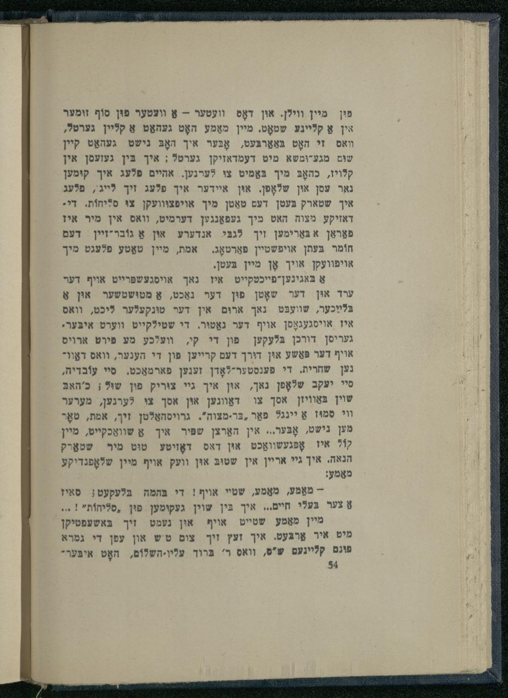 אַ בּאגינען-פייכטקייט איז נאך אױסגעשפּרײט אויף דער ערד אוּן דער שאָטן פוּן דער נאַכט, אַ מטושטשער און אַ בּלײַכער, שוועבּט נאך ארוּם אין דער טונקעלער ליכט, וואס איז אױסגעגאָסן אויף דער נאַטוּר. די שטילקייט ווערט איבּער. געריסן דורכן בּלעקען פון די קי, ווע?כע מע פירט ארויס אויף דער פּאַשע אוּן דורך דעם קרייען פון די הענער, וואס דאַוונען שחרית, די פענסטערללאָדן זענען פארמאַכט. סיי עוֹבדיה, סיי יעקב שלאָפן נאך, אוּן איך גי צוריק פין שוּ?; כ'האבּ שוין בּאַווֹיון אסך צו דאַונען אין אסך צי לערנען, מערער וי סִמוּז אַ יינגל פאַר ,בּר-מצוה". גרױסהאַלטן זיך, אמת, טאָר מען נישט, אָבֶּער... אין האַרצן שפּיר איך אַ שוואַכקײט, מיין קוֹל איז אָפּגעשװאַכט און דאס דאָזיטע טוּט מיר שטאַרק הנאה. איך גיי אריין אין שטובּ אוּן וועק אויף מיין שלאָפּנדיקע מאַמע: