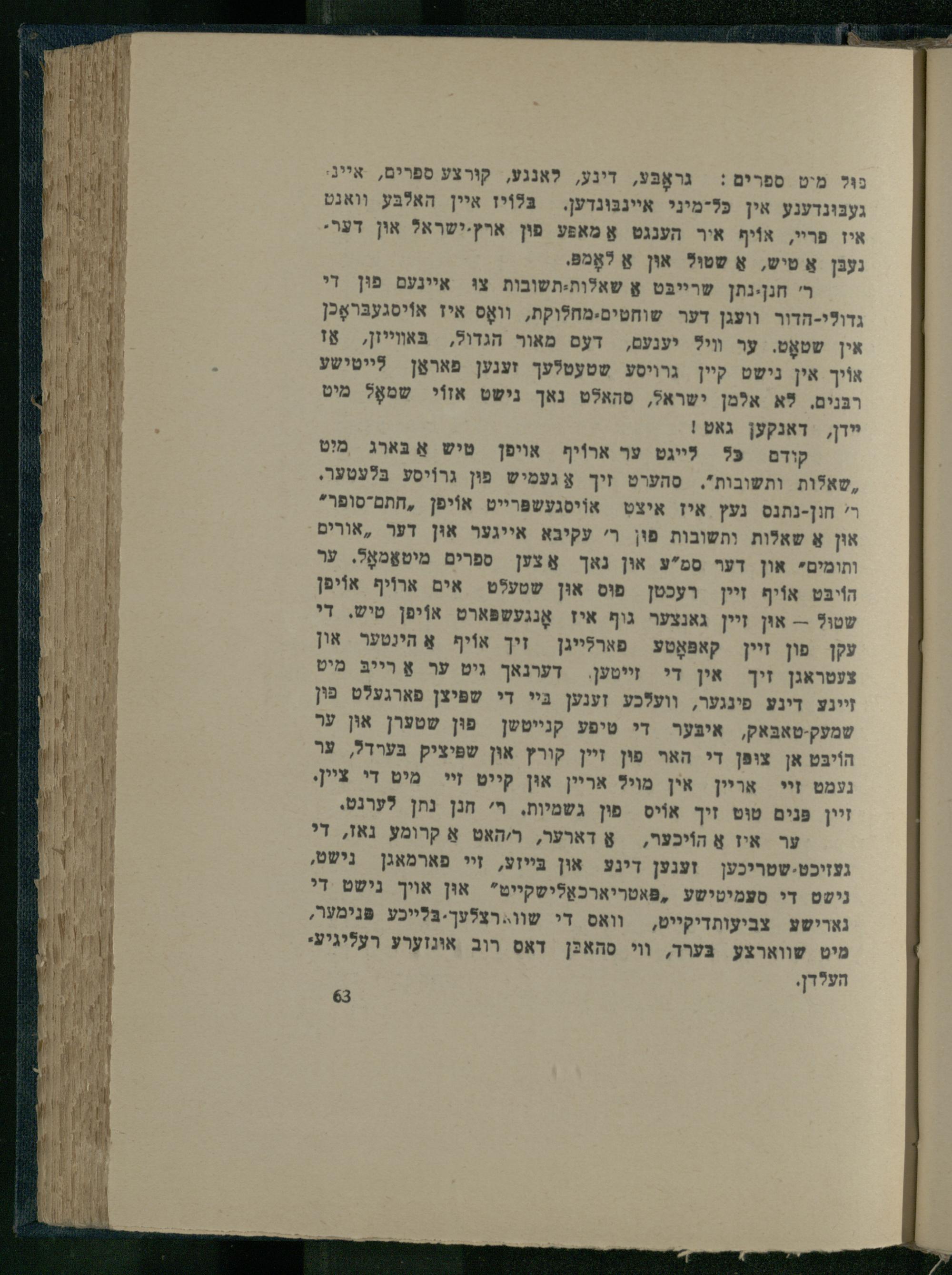 קודם כֹּל לייגט ער ארוֹיף אויפן טיש אַ בּארג מיט טאלות ותשובות". סהערט זיך אַ געמיש פוּן גרוֹיסע בּלעטער, ר' חון-נתנס נעץ איז איצט אוֹיסגעשפּרײט אוֹיפן ,חתם"סופר" אוּן אַ שאלות ותשובות פוּן ר' עקיבא אייגער אוּן דער ,אורים ותומים* און דער סמ"ע און נאך אַצען ספרים מיטאַמאָל. ער הוֹיבּט אוֹיף זיין רעכטן מוס און שטעלט אים ארוֹיף אוֹיפן שטול-- און זיין גאנצער גוף איז אָנגעשפּארט אוֹיפן טיש. די עקן פון זיין קאפּאָטע פארלייגן זיך אוֹיף אַ הינטער און צעטראגן זיך אין די זייטען. דערנאך גיט ער אַ רייבּ מיט זיינע דינע פינגער, וועלכע זענען בּײ די שפּיצן פארגעלט פין שמעק-טאבּאק, איבּער די טיפע קנייטשן פוּן שטערן און ער הוֹיבּט אן צופן די האר פון זיין קורץ און שפּיציק בּערד?, ער נעמט זי אריין אין מוי? אריין אוּן קייט זײ מיט די ציין. זיין פּנים טוט זיך אוֹיס פוּן גשמיות. ו' חנן נתן לערנט.