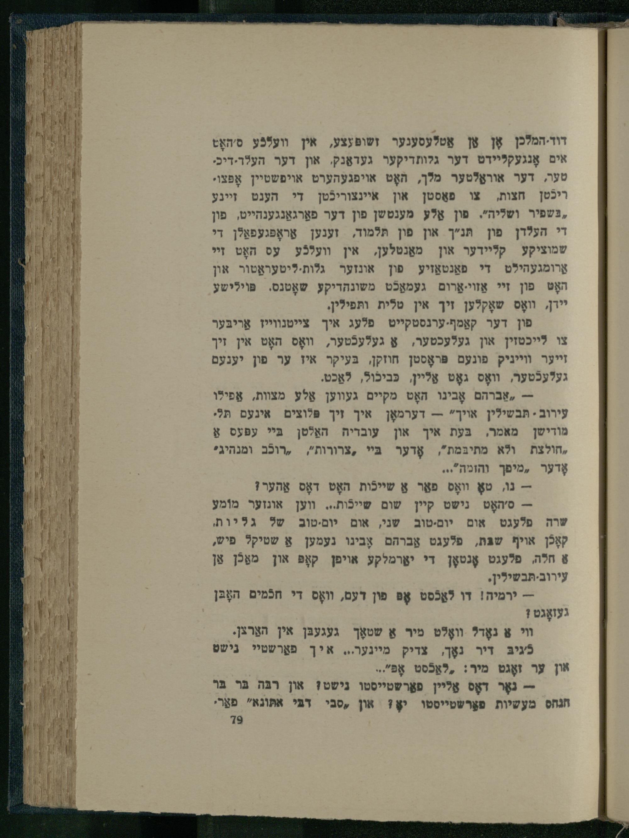 דוד.המלכן אָן אַן אַטלעסענער זשופּעצע, אין וועלפע ס'האָט אים אָנגעקליידט דער גלותדיקער געדאַנק. און דער העלר-דיכ. טער, דער אוראַלטער מלך, האָט אויפגעהערט אויפשטיין אָפּצוי ריכֿטן חצות, צו פאַסטן און איינצוריפֿטן די הענט זיינע -בּשפיר ושליה". פון אַלע מענטשן פון דער פאַרגאַנגענהייט, פון די העלדן פון תנ"ך און פון תּלמוד, זענען אַראָפּגעפאַלן די שמוציקע קליידער און מאַנטלען, אין װעלפֿע עס האָט זי אַרומגעהילט די פאַנטאַזיע פון אונזער גלות ליטעראַטור און האָט פון זי אַזױאַרום געמאַכֿט משונהדיקע שאָטנס. פּוֹילישע יירן, װאָס שאָקלען זיך אין טלית ותּפילין,