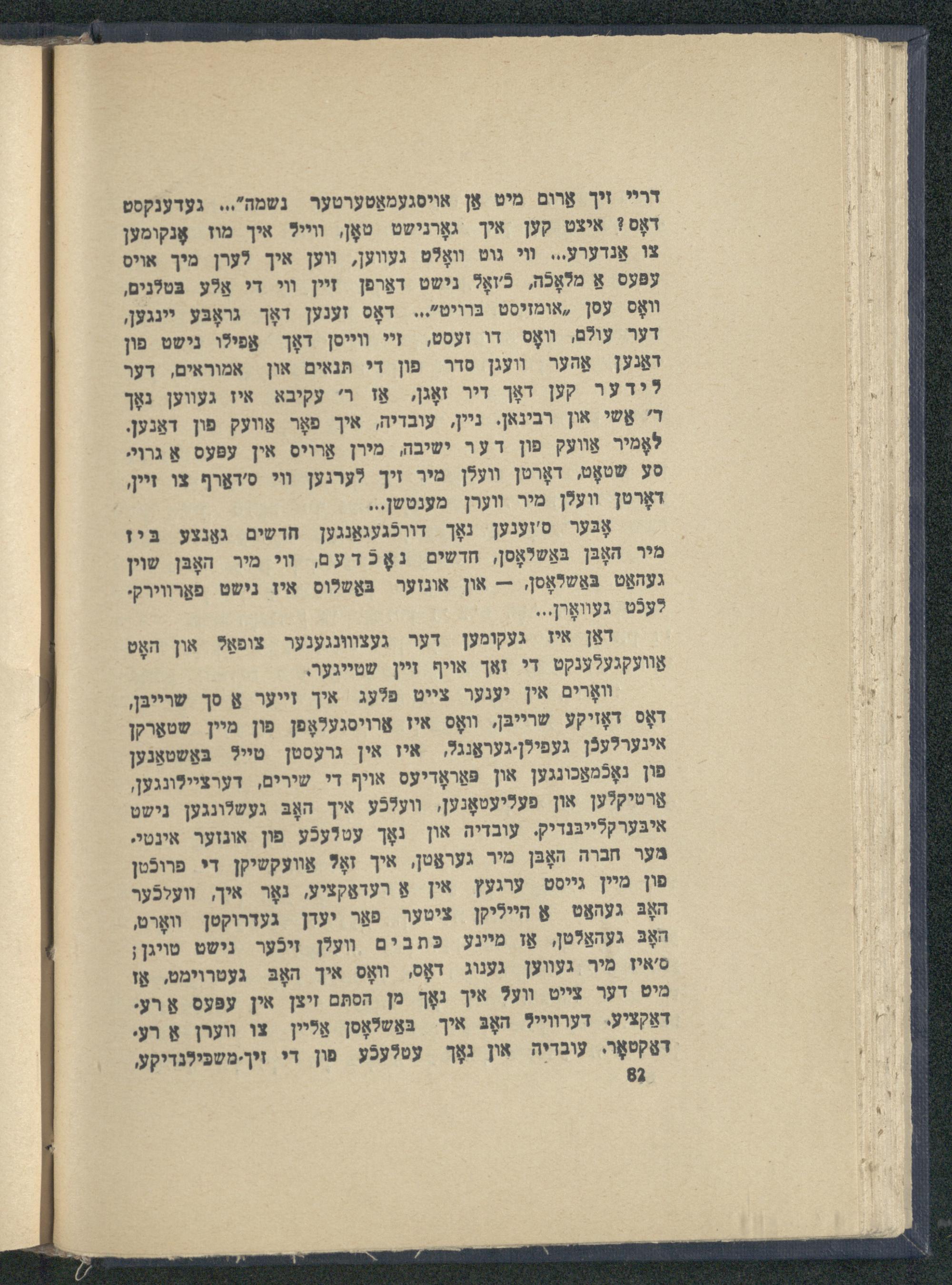 דריי זיך אַרום מיט אַן אױסגעמאַטערטער נשמה"... געדענקסט דאָס? איצט קען איך גאָרנישט טאָן, ווייל איך מוז אָנקומען צו אַנדערע... װי גוט װאָלט געווען, װען איך לערן מיך אויס עפּעס אַ מלאָכה, כ'זאָל נישט דאַרפן זיין וי די אַלע בּטלנים, װאָס עסן ,אומזיסט בּרױיט"... דאָס זענען דאָך גראָבּע יינגען, דער עולם, װאָס דו זעסט, זיי װײיסן דאָך אַפילו נישט פון דאַנען אַהער ועגן סדר פון די תּנאים און אמוראים, דער לידער קען דאָך דיר זאָגן, אַז ר' עקיבא איז געווען נאָך די אַשי און רבינאן. ניין, עובדיה, איך פאָר אַװעק פון דאַנען. לאָמיך אַװעק פון ד ער ישיבה, מירן אַרױס אין עפּעס אַ גרוי. סע שטאָט, דאָרטן וועלן מיר זיך לערנען וי ס'דאַרף צו זיין, דאָרטן װעלן מיר װוערן מענטשן...