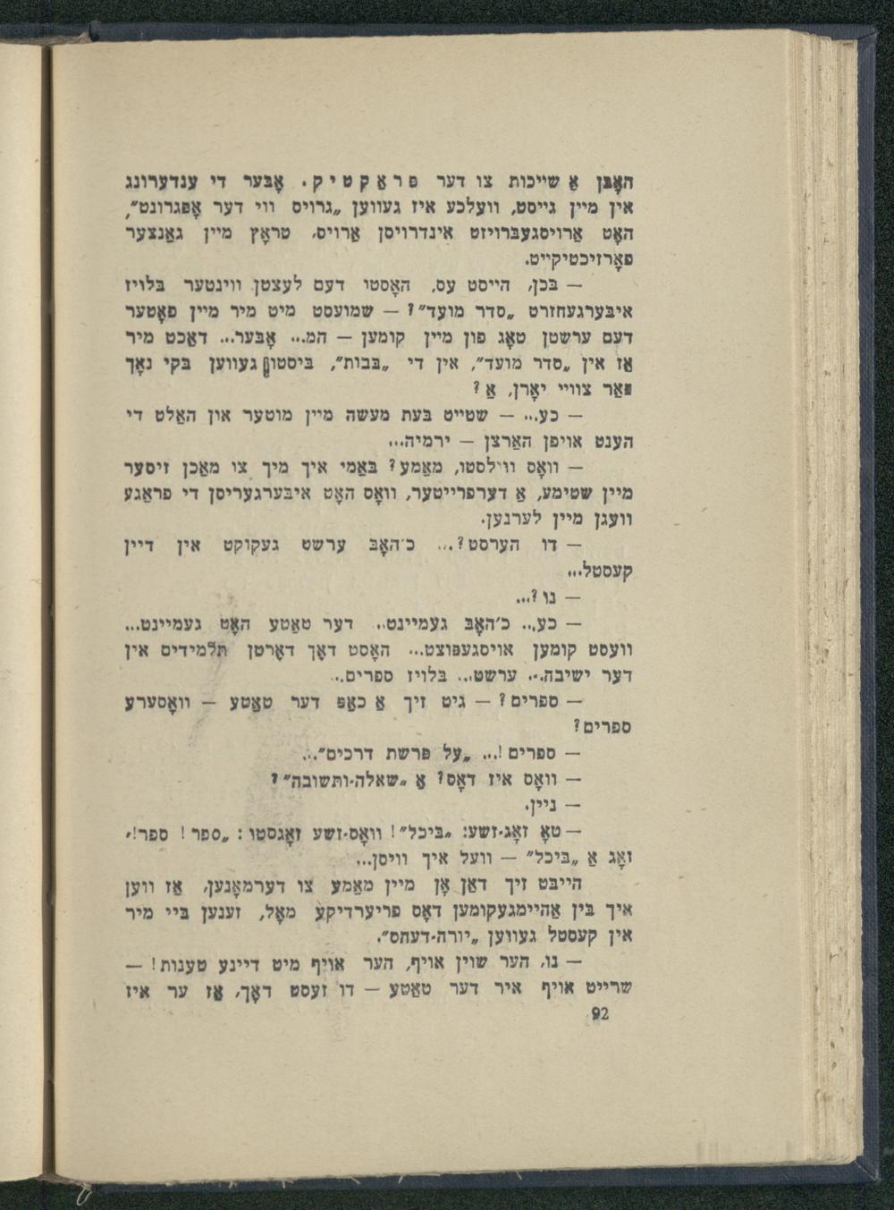 -- בּכן, הייסט עס, האָסטו דעם לעצטן ווינטער בּלױיז איבּערגעחזרט ,סדר מועד"!-- שמועסט מיט מיר מיין פאָטער דעם ערשטן טאָג פון מיין קומען-- המ... אָבֶּער... דאַכט מיר אַז אין ,סדר מועד", אין די ,בּבות", בּיסטון געווען בּקי נאָך פאַר צוויי יאָרן, אַ!