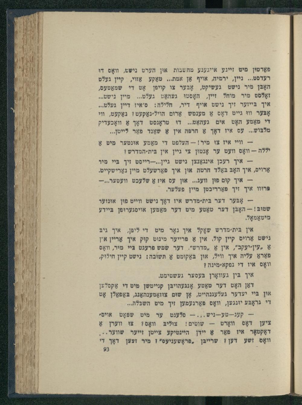 - קענ--טע--ניש...-- פלעגט ער מיט שפּאָט אויסי ציען דאָס װאָרט-- שוטים! צוּליבּ װאָס! צוּ װערן אַ דאָקטאָר איז פאַר אַ יידן היינטיקע צייטן זײער שווער.., װאָס זשע דען! שרייבּן.פּראָטעניעס"! מיר זעען דאָך די 93