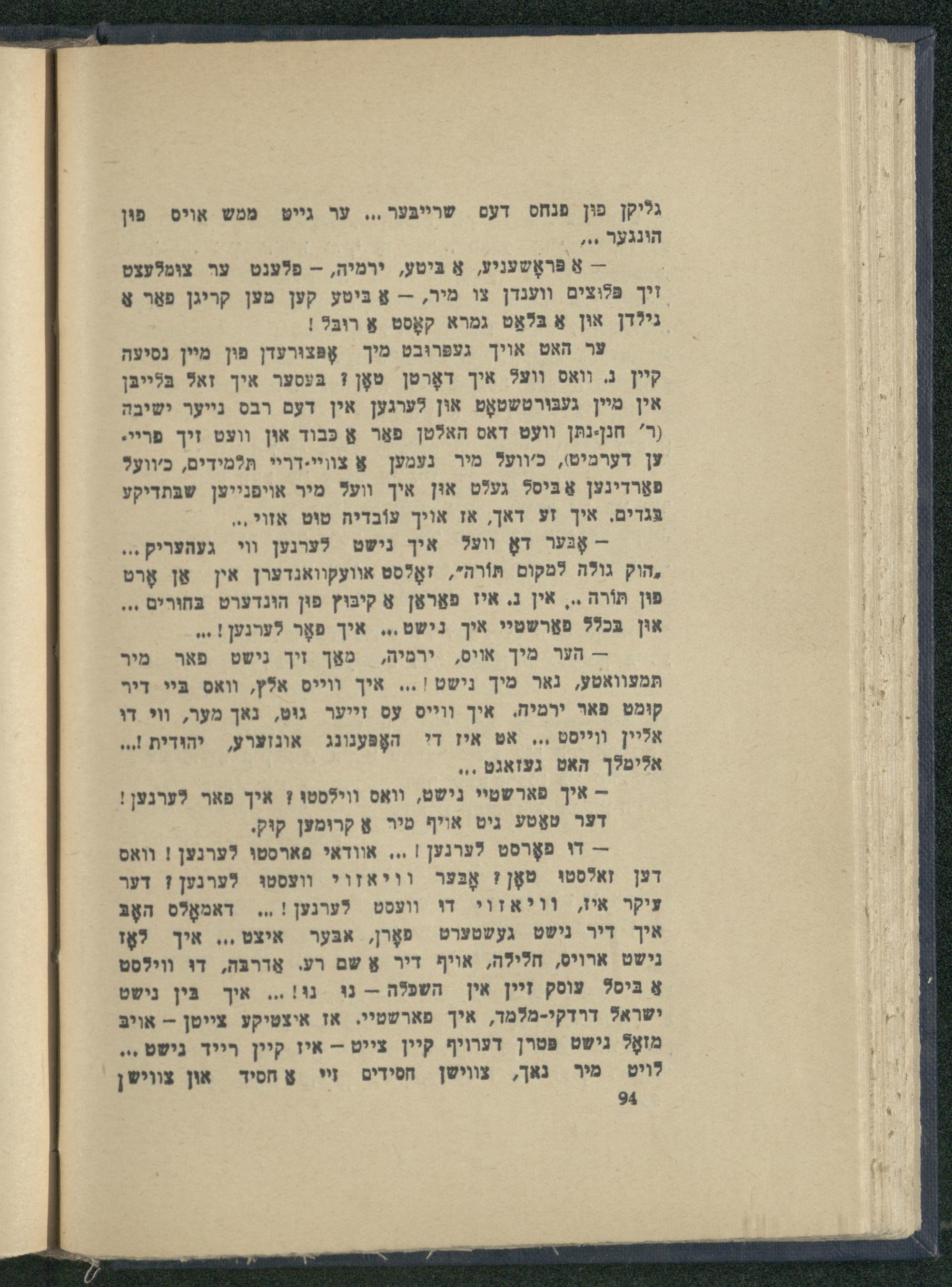 -- דו פאָרסט לערנען|... אוודאי פארסטי לערנען! וואס דען זאלסטיו טאָן! אָבֶּער וויאזוי װעסטוּ לערנען! דער עיקר איז, וֹו'אזוי דו װועסט לערנען!.. דאמאָלס האָבּ איך דיר נישט געשטערט פאָרן, אבּער איצט... אין לאָז נישט ארויס, חלילה, אויף דיר אַ שם רע. אַדרבּה, דוּ ווילסט אַ בּיסל עוסק זיין אין השפלה-- נוּ נוּ!... איך גִּין נישט ישרא?ל דרדקי-מלמר, איך פארשטיי. אז איצטיקע צייטן-- אויבּ מזאָל גישט פטרן דערויף קיין צייט- איז קיין רייד נישט... לוט מיר נאך, צווישן חסידים זײ אַ חסיד און צווישן